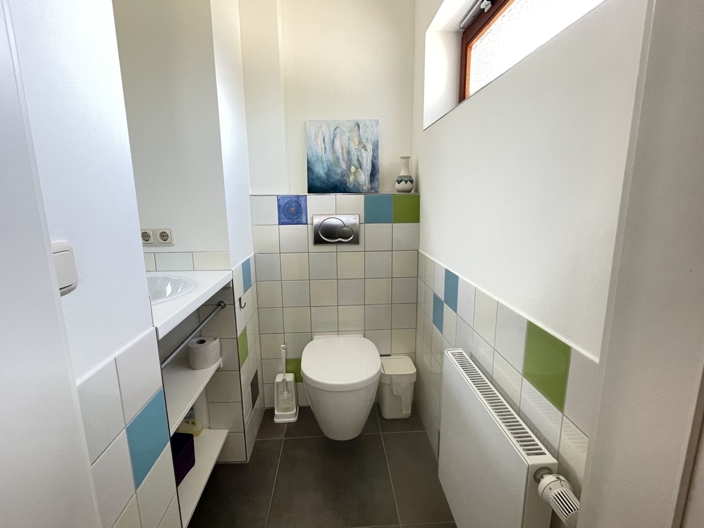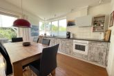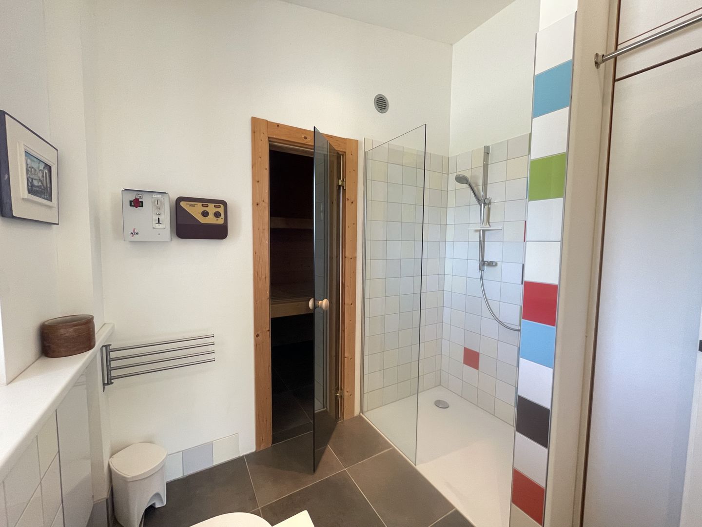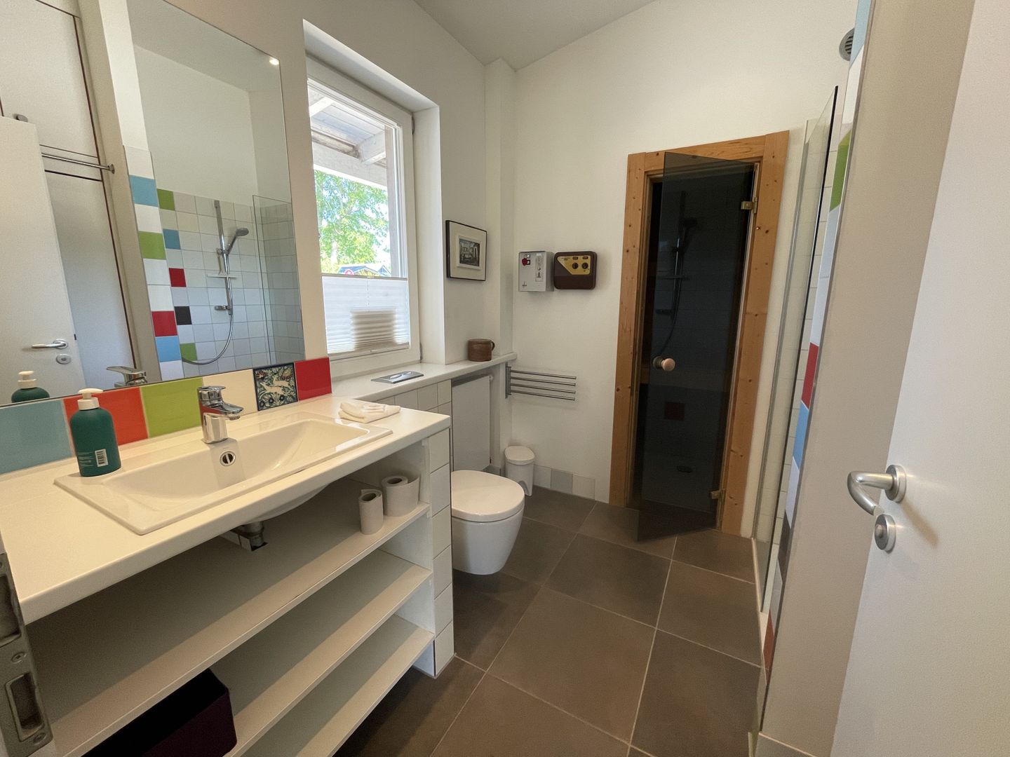 Im Erdgeschoss befindet sich zudem ein Bad mit Dusche (Haarfön vorhanden), ein Gäste-WC, eine Sauna und ein großer Wohnraum mit integrierter Küche (Geschirrspüler, Mikrowelle mit Grill, Kühlschrank mit Gefrierfach, E-Herd mit Umluft, Cerankochfeld, Waschmaschine und Trockner, Toaster, Wasserkocher, Kaffeemaschine) und dänischem Ofen.