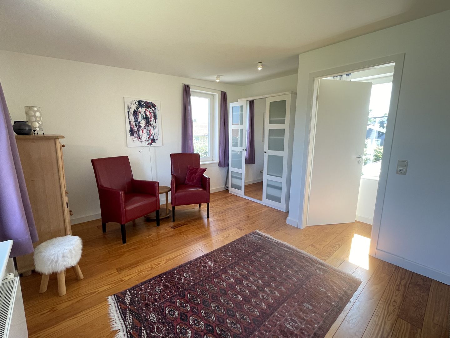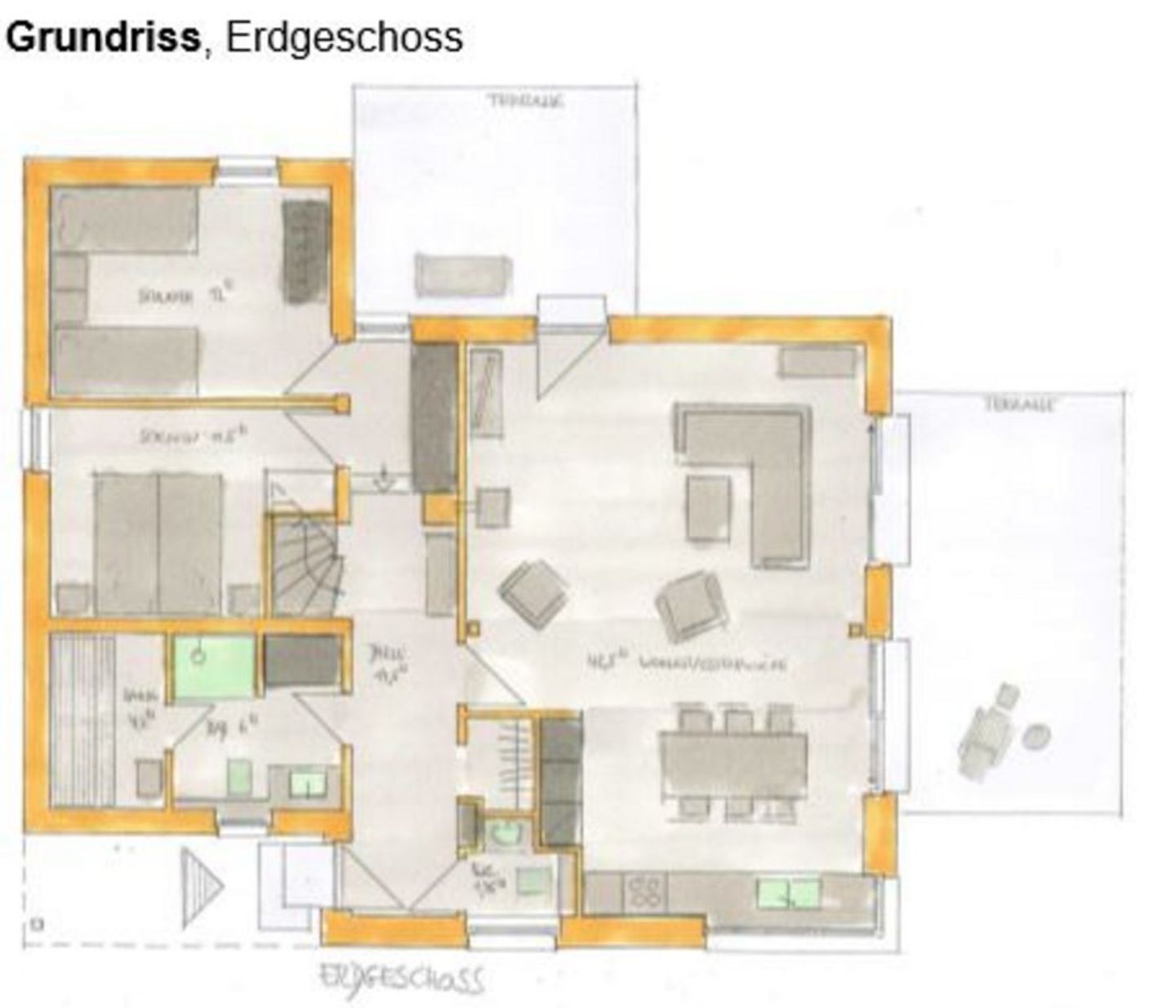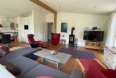 Vom Wohnzimmer aus kommen Sie auf eine der beiden Terrassen und in den großen Garten - so ist auf jeden Fall Sonne garantiert.
