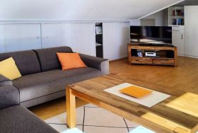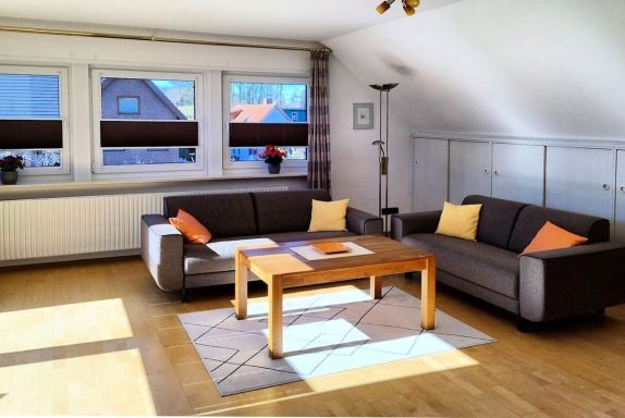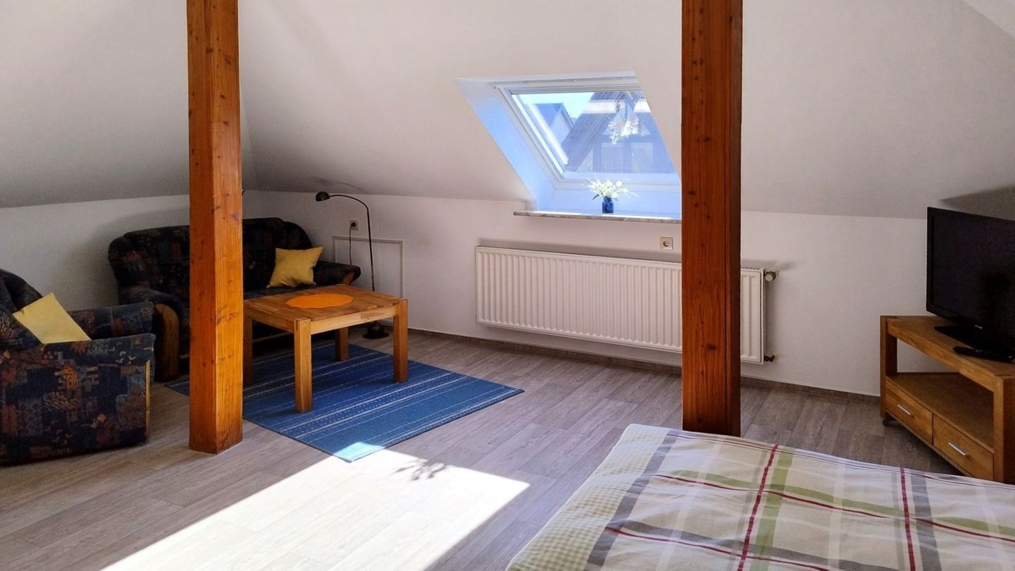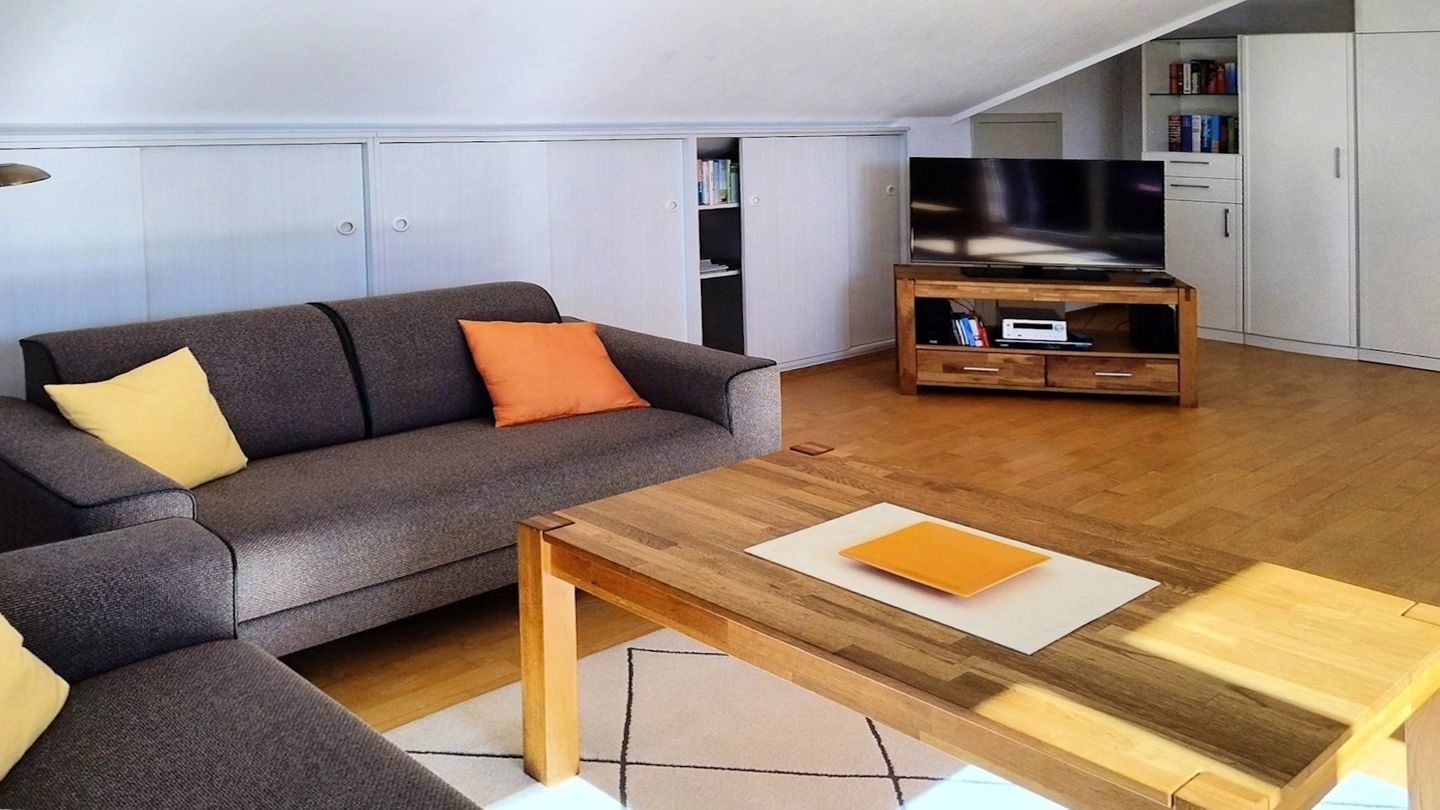 Ein großes Wohnzimmer mit integrierter Essecke und kuscheligem Sofa lädt zum Relaxen und Entspannen ein.