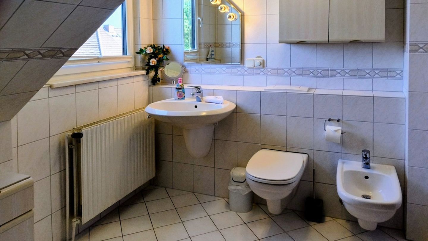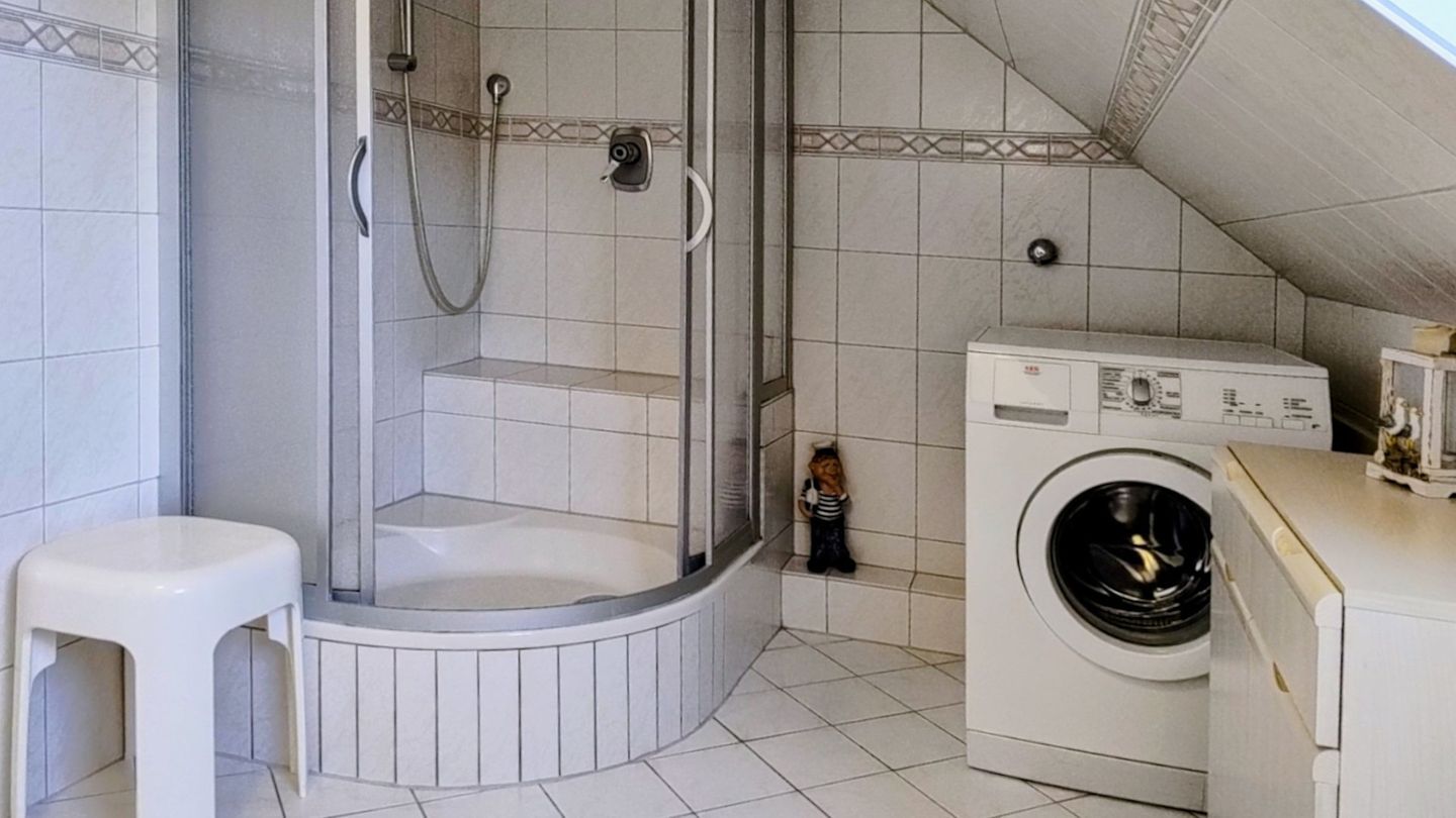 Das helle freundliche Bad verfügt über eine Dusche, WC/ Bidet, sowie eine Waschmaschine.