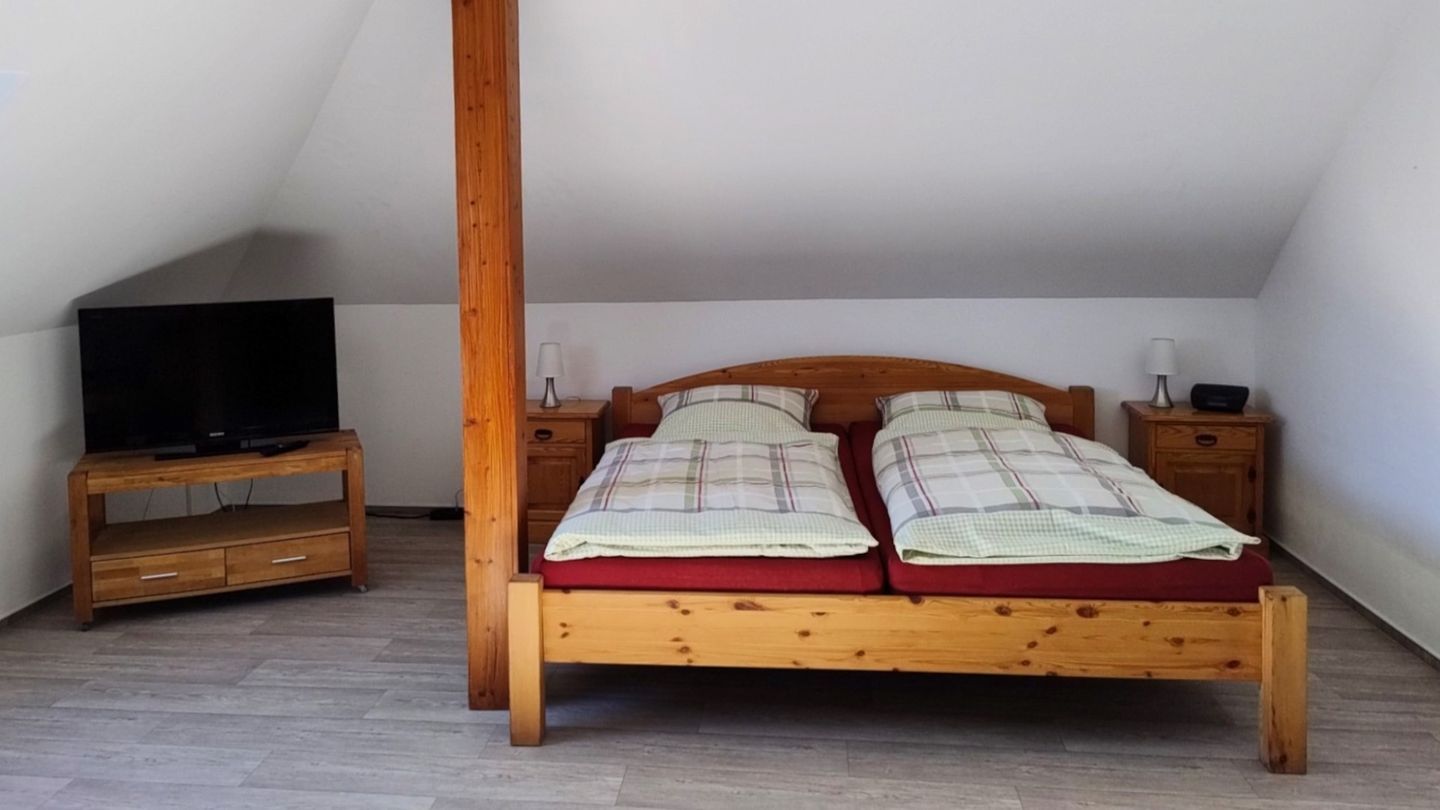 Das Schlafzimmer ist großzügig gehalten und verfügt über bequeme, rückenschonende Matratzen, einen kleinen zusätzlichen Fernseher und eine Sitzecke.