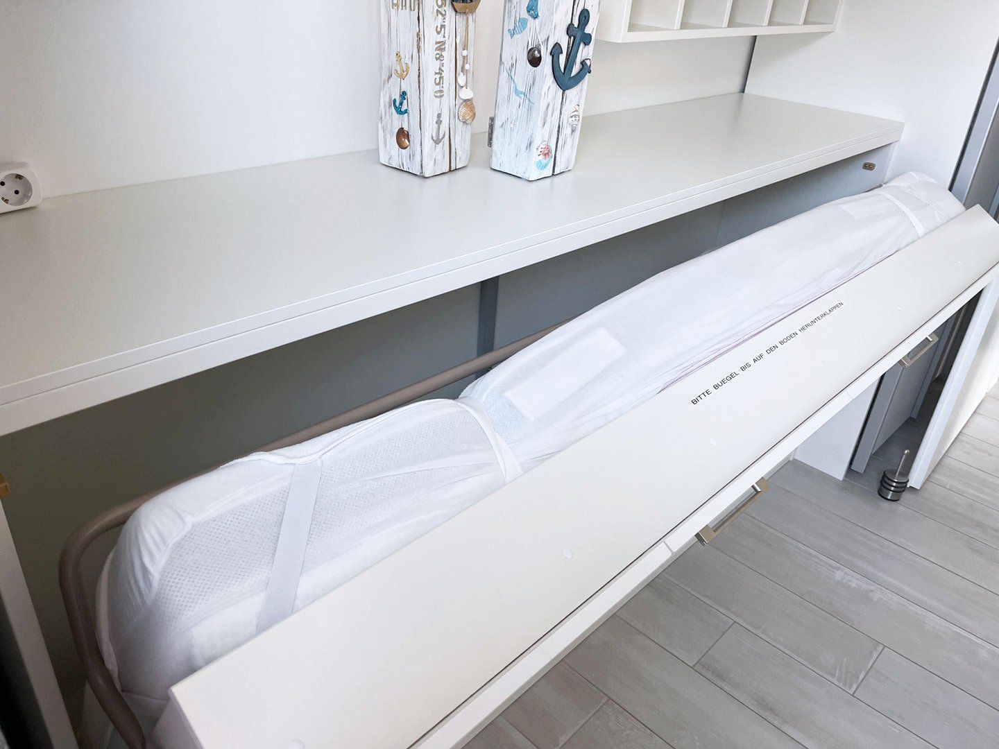 Als Schlafmöglichkeiten dienen ein Boxspringbett (180x200 cm) und im zweiten Schlafzimmer ein Einzelbett (100x200 cm) und ein Schrankbett (90x200 cm).