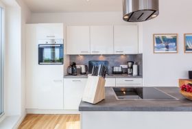 Das Penthouse „Horizont“ besticht durch seine unmittelbare Nähe zum Kappelner Hafen und den uneingeschränkten Blick auf die Hebebrücke und den Museumshafen.