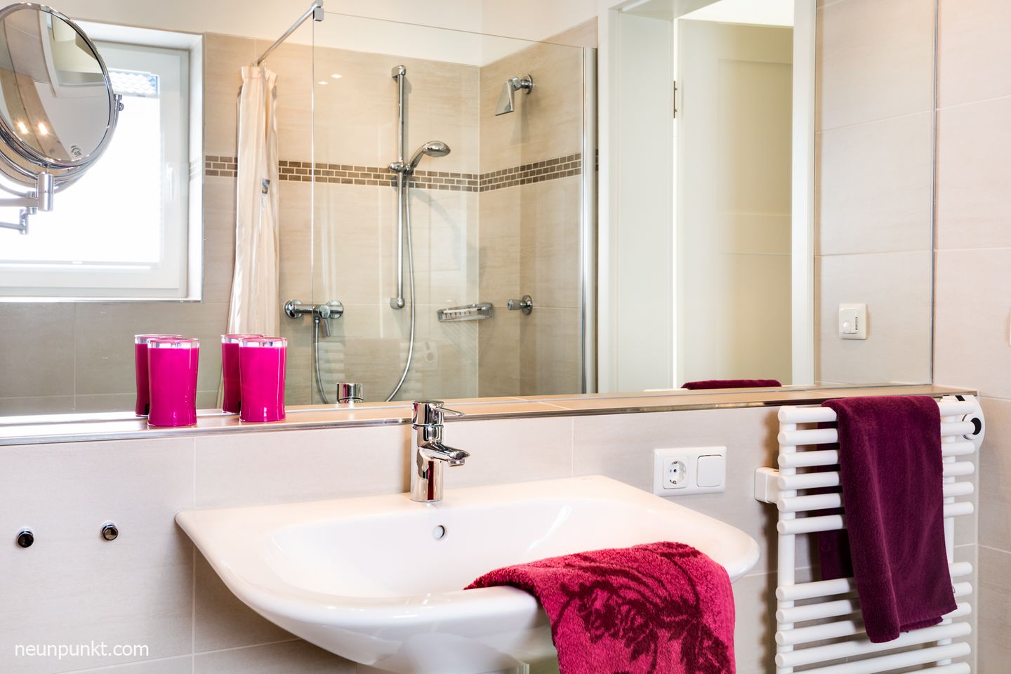 Das schöne Badezimmer mit Schwallbrause und Extras wie Kosmetikspiegel sind dort vorhanden.