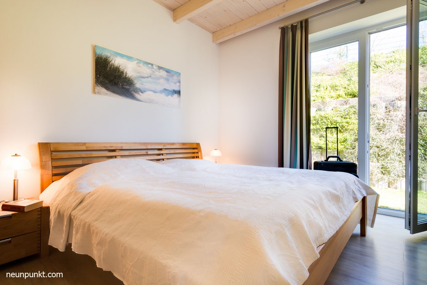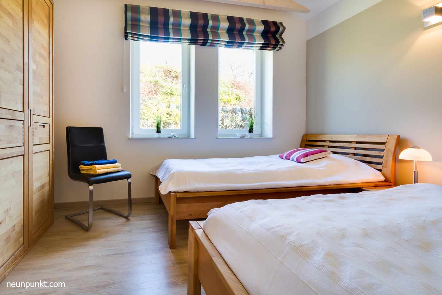 Vom gemütlichen Wohn- und Essbereich mit Elektrokamin und offener Küche bis hin zu den zwei Schlafzimmern (1x mit Doppelbett (2x 90x200 cm), einmal mit zwei Einzelbetten (jeweils 100x200 cm) mit bequemen Betten bietet dieses Ferienhaus umfangreichen Komfort.