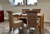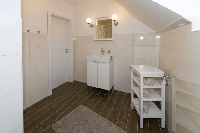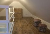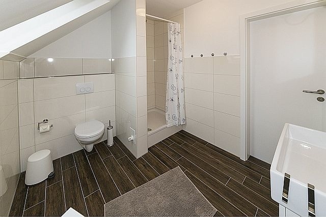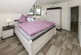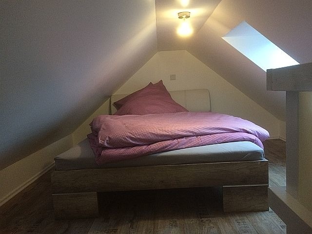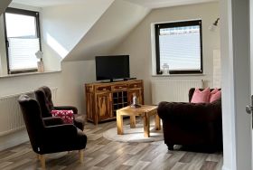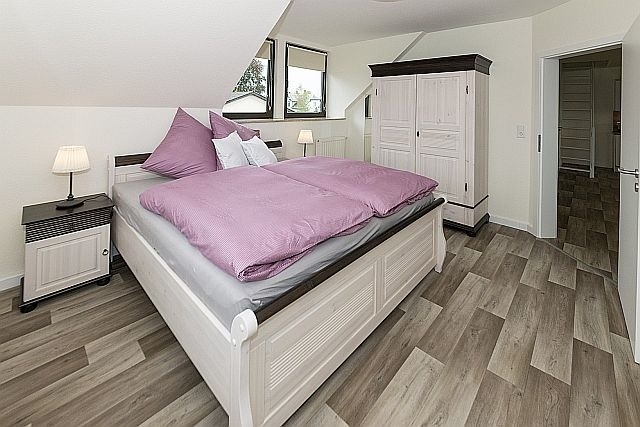 Die liebevoll eingerichtete Nichtraucher-Wohnung liegt im Obergeschoss und bietet Platz für bis zu 4 Personen. Ihnen stehen eine Wohnküche mit Einbauküche, TV und WiFi, Schlafzimmer mit komfortablen Betten und ein Duschbad mit Haartrockner zur Verfügung. Entspannen können Sie sich auf der hauseigenen Terrasse oder im Strandkorb. Die Wohnküche bietet Ihnen Raum für gemeinsames Essen und entspannte Abende vor dem Fernseher. In der großzügig ausgestatteten Küche können Sie gemeinsam kochen. Ein Schlafzimmer mit Doppelbett verfügt über einen Kleiderschrank, die zweite Schlafmöglichkeit ist kombiniert mit dem Wohnbereich. Sie ist ausgestattet mit einem Doppelbett und für Kinder ab 4 Jahren und Junggebliebene geeignet. In dem Zimmer befindet sich eine Wandschräge, daher bietet es wenig Deckenhöhe. Der Raum ist über eine schmale eingebaute Treppe zu erreichen.