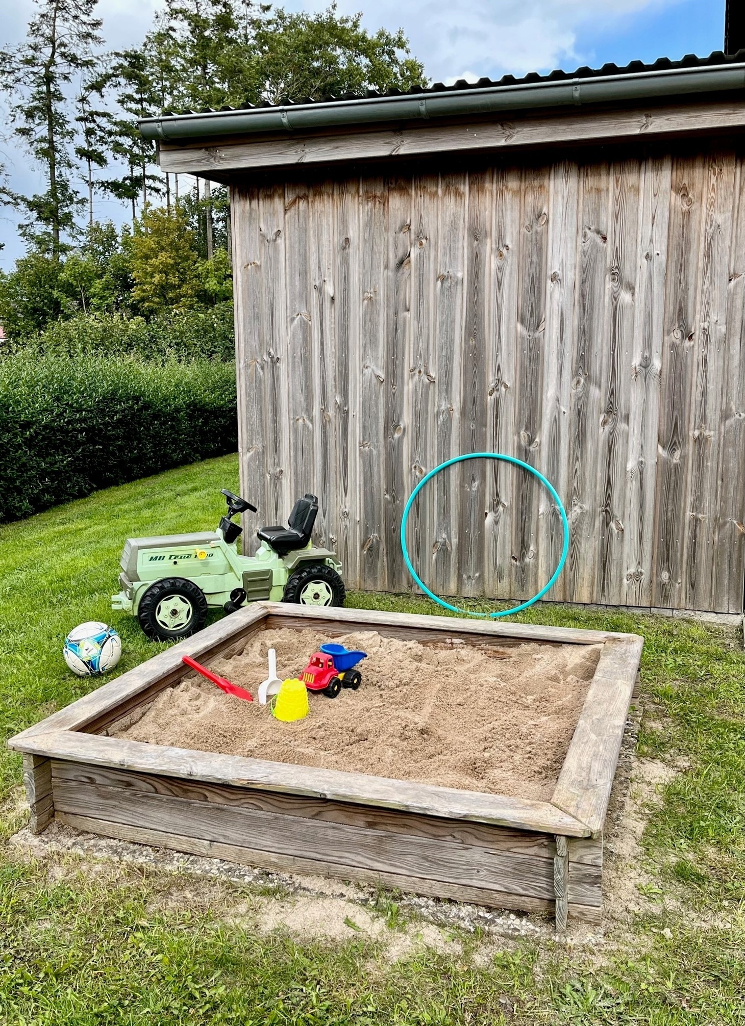 Für unsere kleinen Gäste stehen eine Sandkiste, Spielzeug und ein Fußballtor bereit.