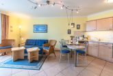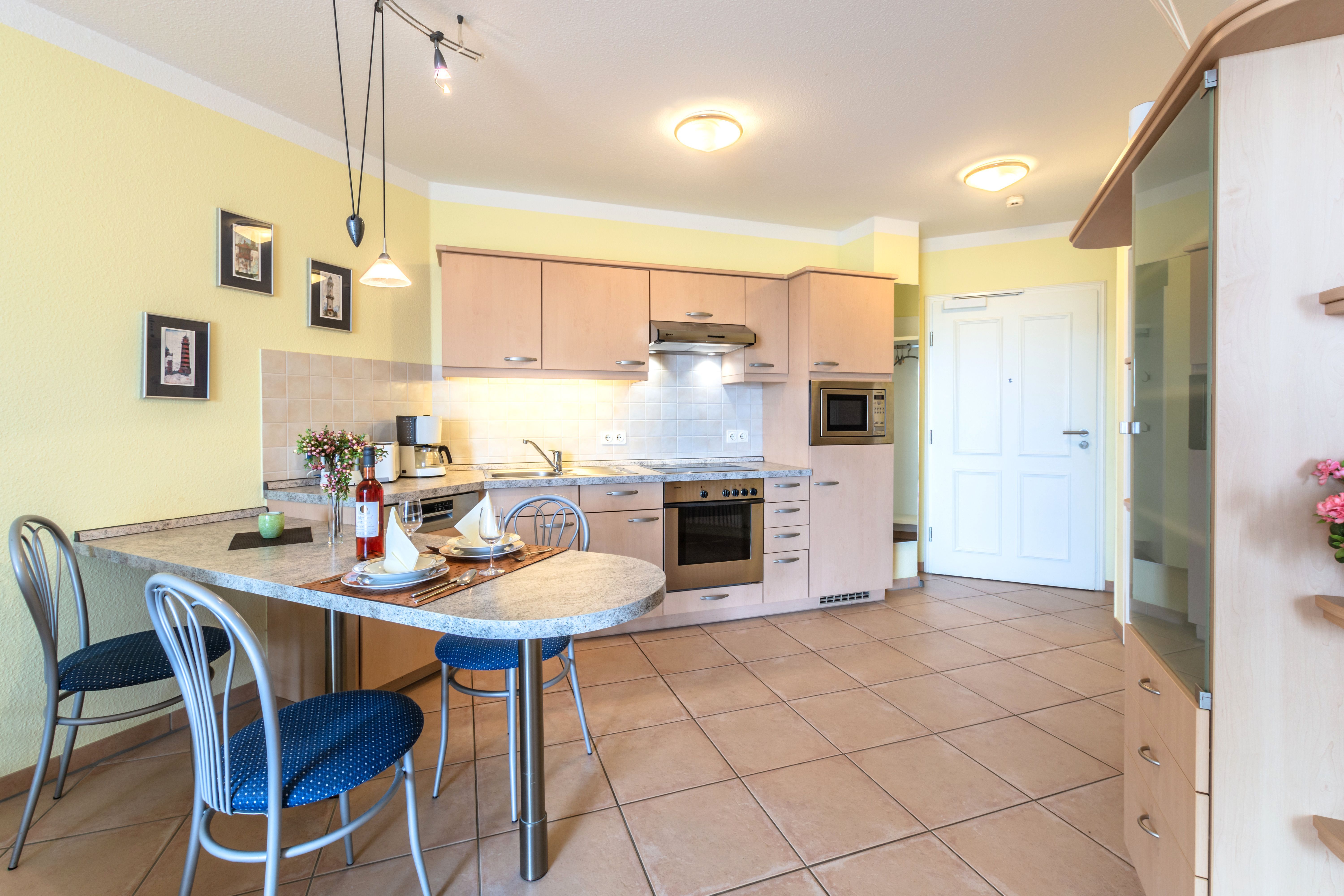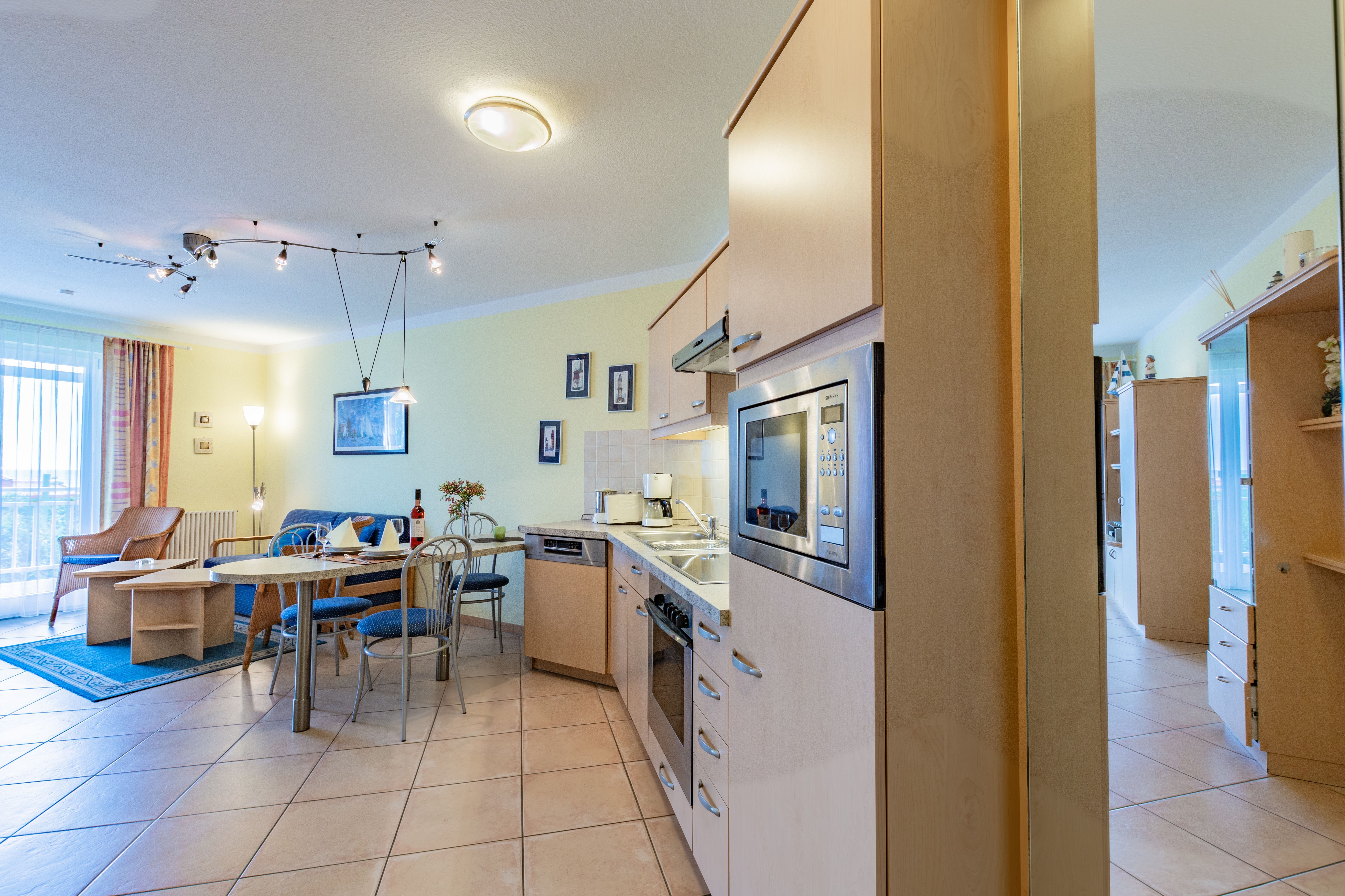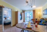 Die Wohnung verfügt über einen möbilierten Balkon mit frontalem Ostseeblick. Der grosse offene Wohnraum verfügt über einen Flachbildschirm-TV von der Firma „Loewe“, Stereoanlage mit CD-Player, sowie einer bequemen Sitzlandschaft mit Schlaffunktion. Die Küchenzeile ist komplett ausgestattet mit Geschirrspüler, Ceran-Back-Herd, Mikrowelle und weiteren nützlichen Geräten wie Kaffeemaschine, Toaster, Wasserkocher etc. Das Schlafzimmer mit komfortablem Doppelbett und Kleiderschlank mit Safe verfügt über einen direkten Zugang zum grossen Balkon. Badezimmer mit Eckdusche, WC und Fön.
