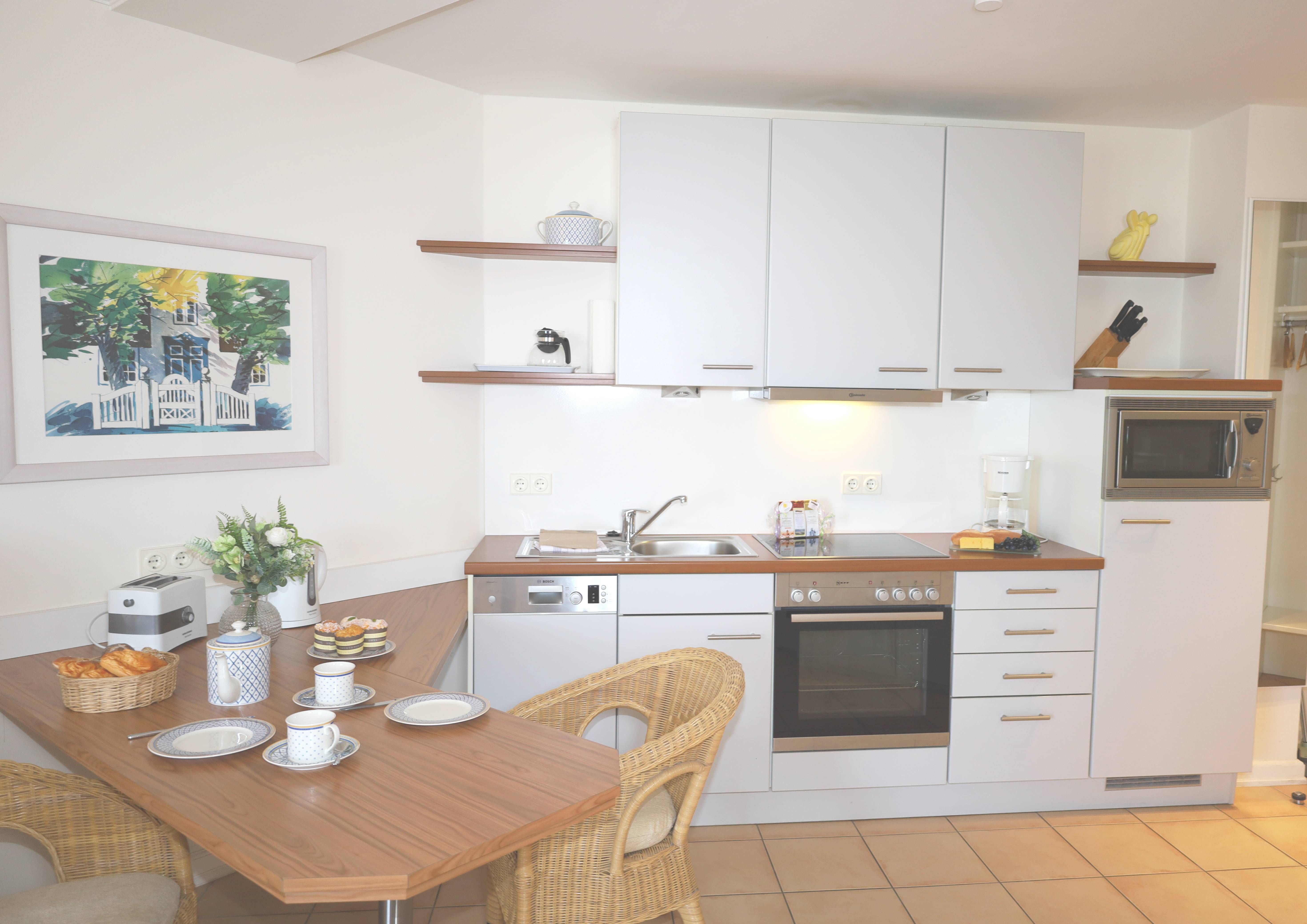 Im hellen Wohnzimmer erwarten Sie ein Flachbild-TV, eine Stereoanlage mit CD-Player und eine gemütliche Sitzlandschaft, die zu entspannten Stunden einlädt. Die moderne Küchenzeile ist vollständig ausgestattet mit Geschirrspüler, Ceran-Back-Herd, Mikrowelle sowie praktischen Extras wie Kaffeemaschine, Toaster und Wasserkocher.