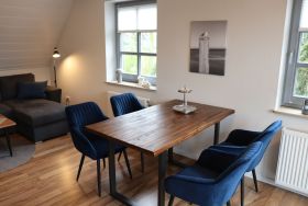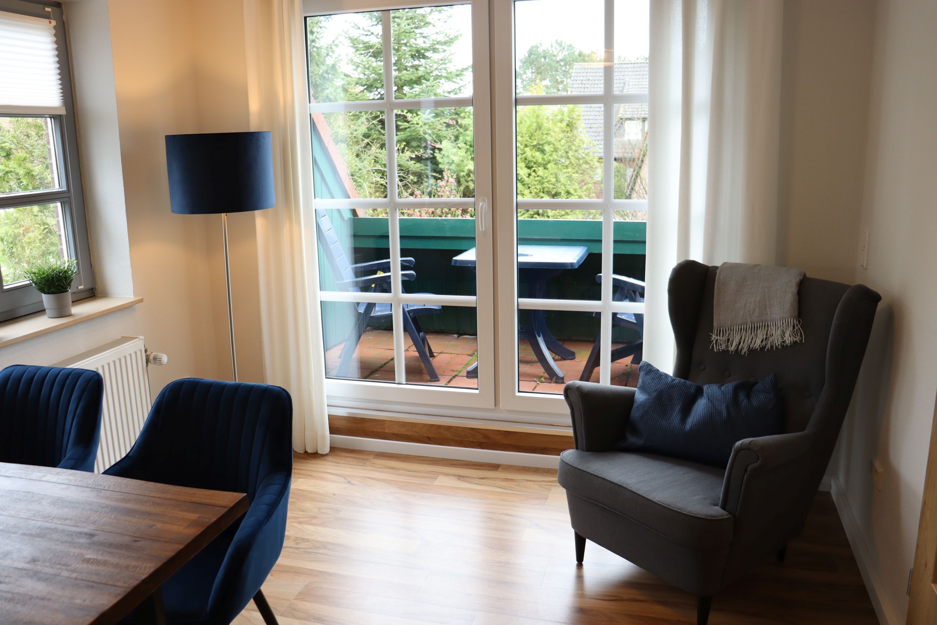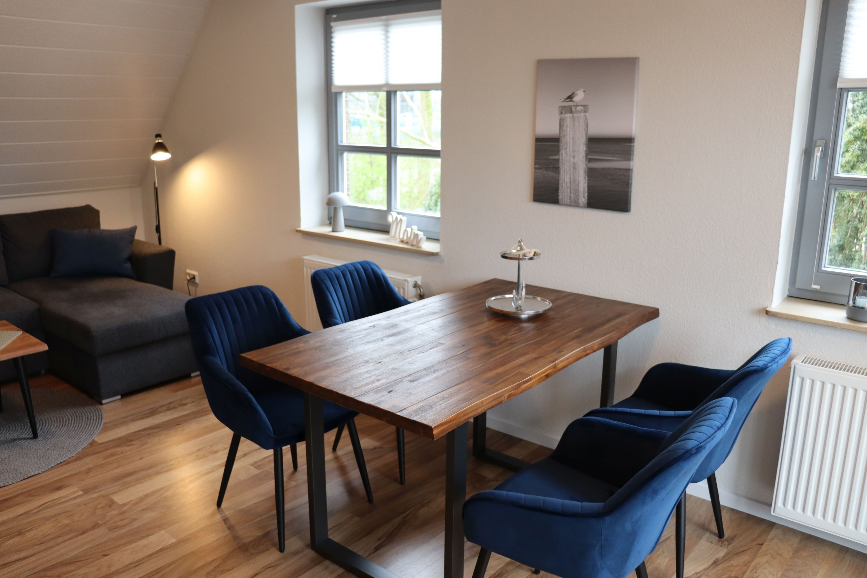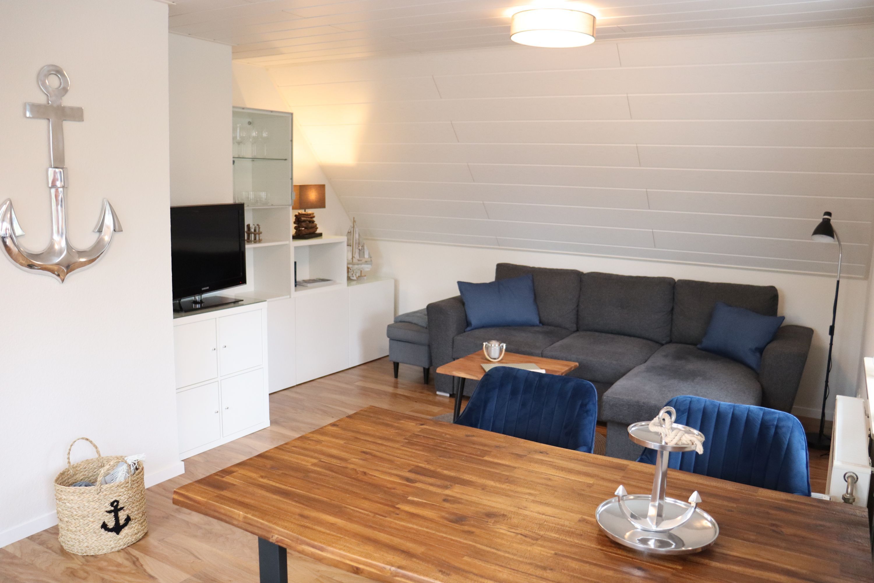 Unsere Ferienwohnung verfügt über ein großes helles Wohnzimmer mit Essbereich, einer zusätzlichen Schlafmöglichkeit und einem schönen Südbalkon zum Entspannen.