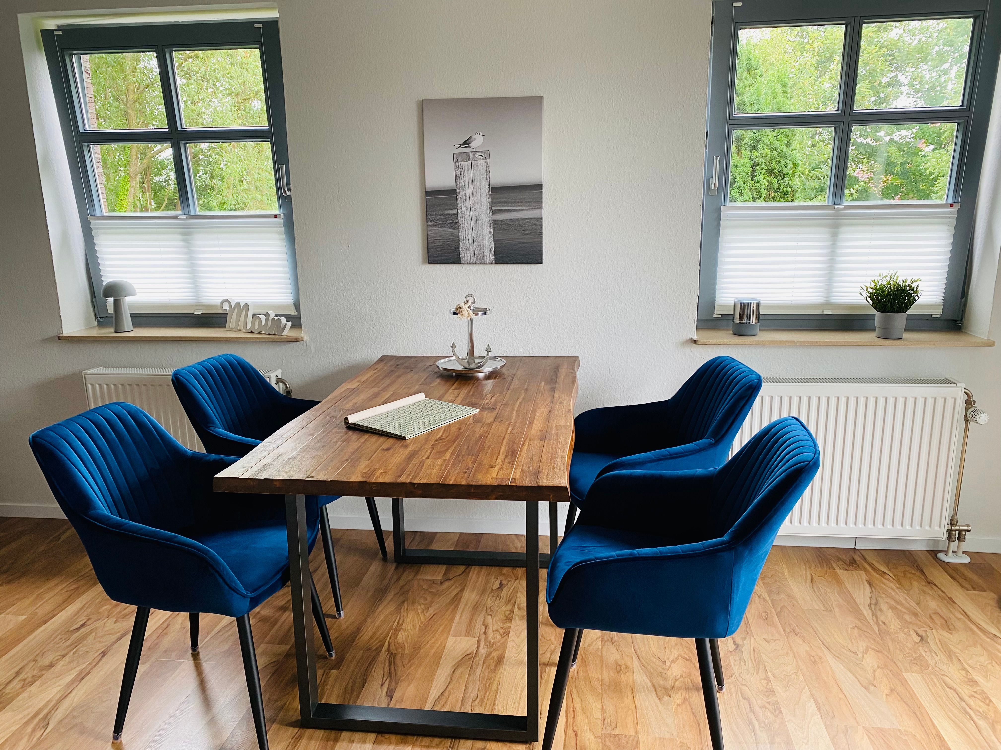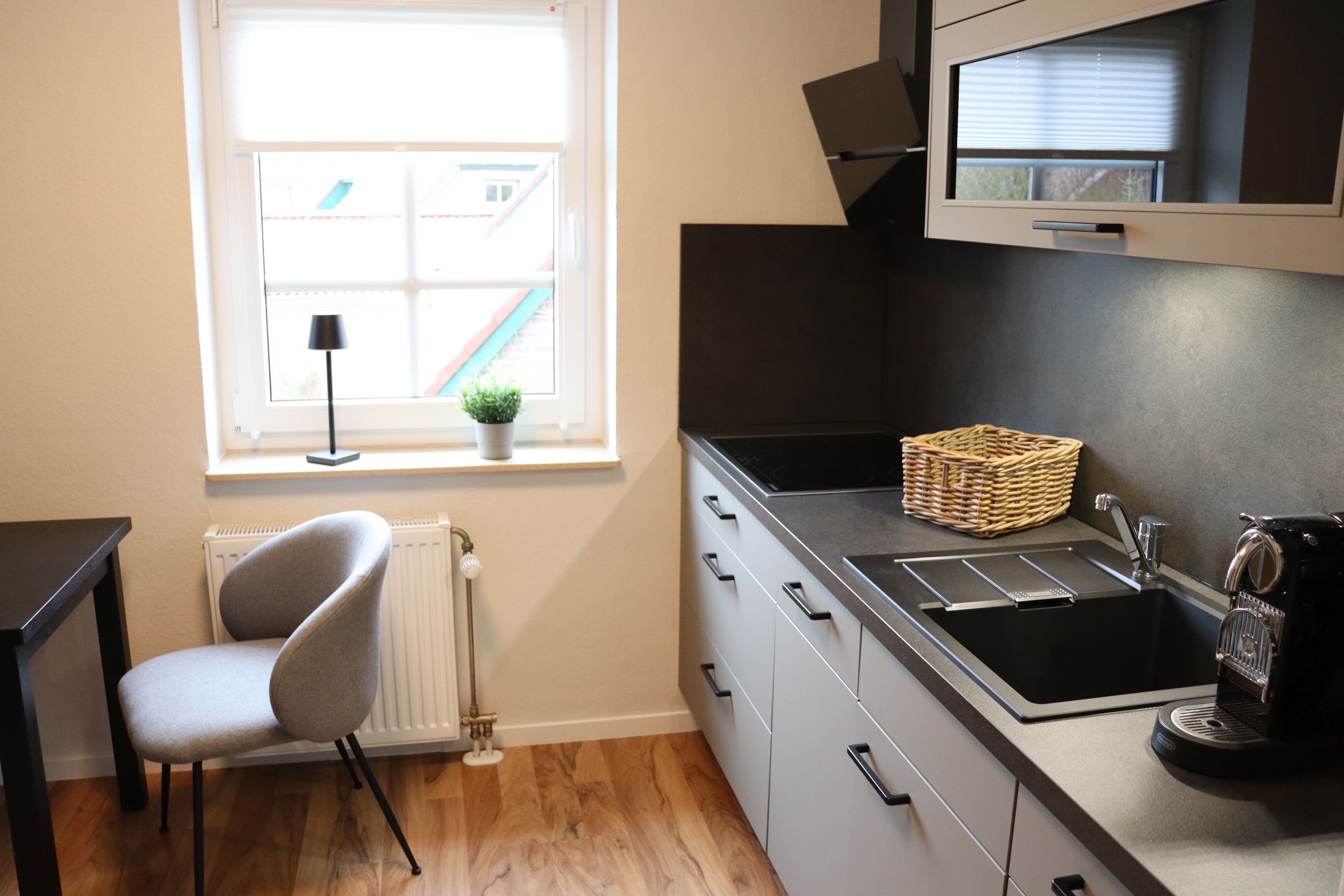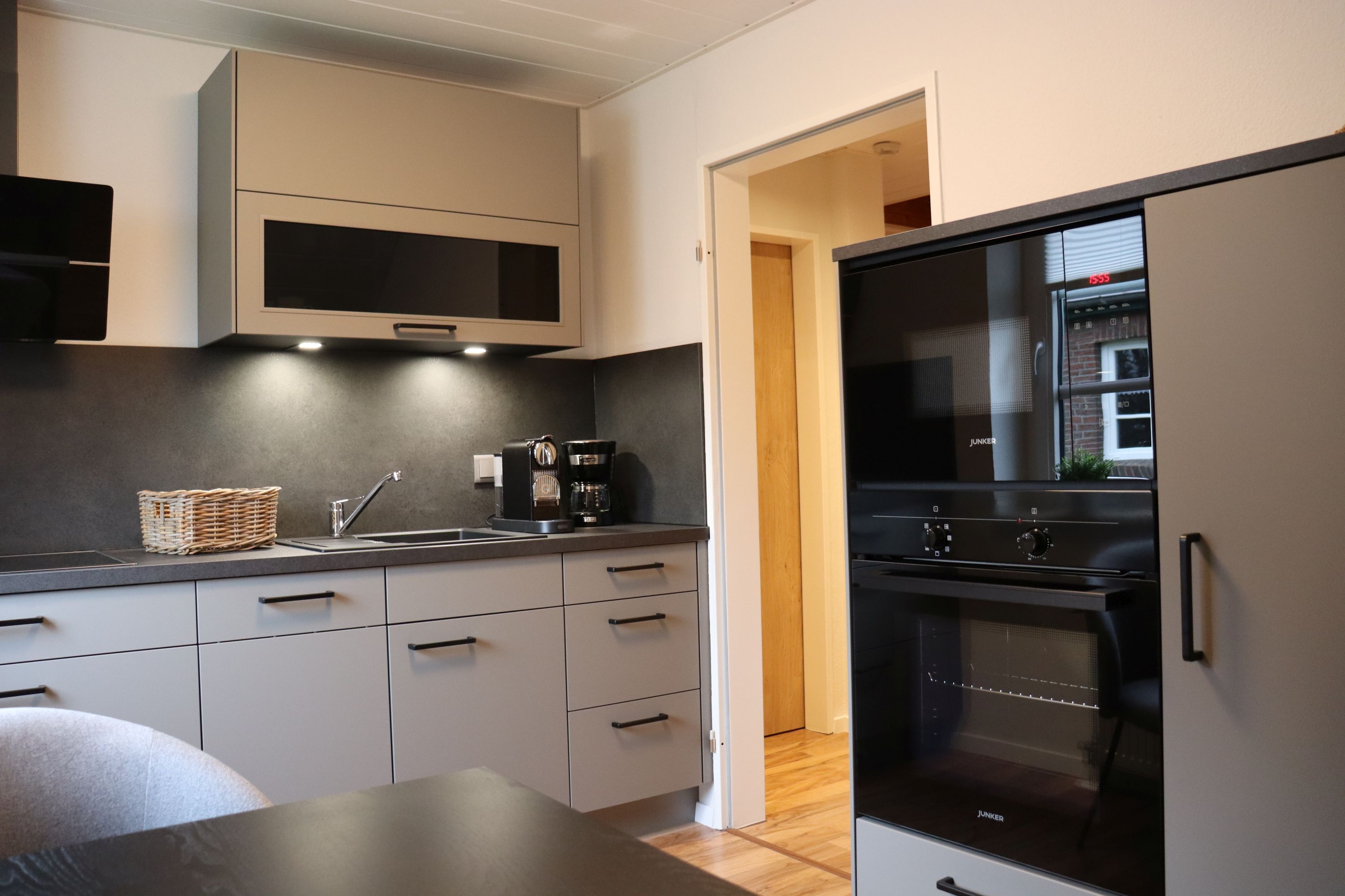 Die neue Küche ist ausgestattet mit allen notwendigen Geräten und Utensilien für den täglichen Bedarf und mit einem Frühstückstisch für zwei.