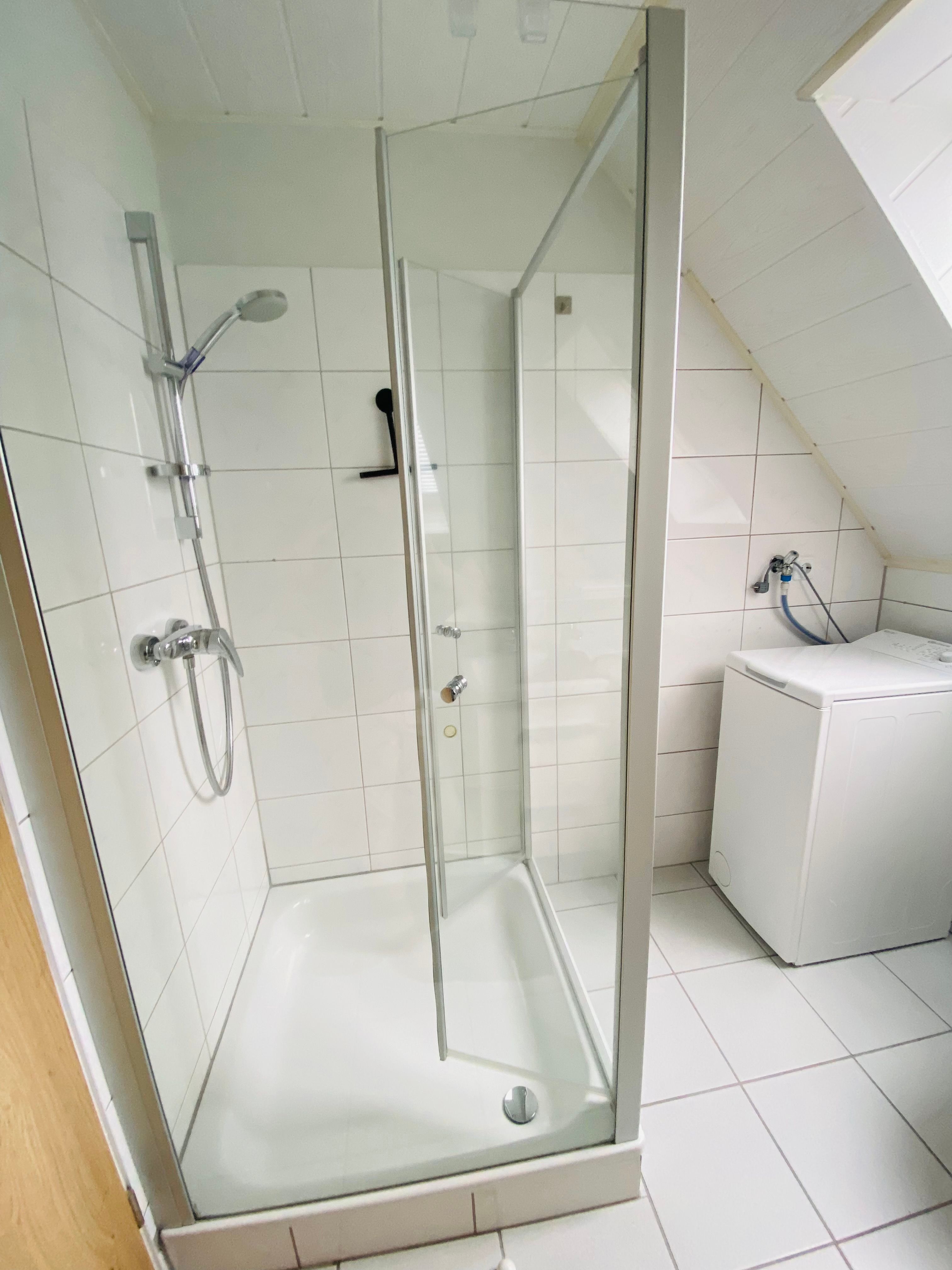 Das Badezimmer mit Tageslicht verfügt über eine Dusche und Waschmaschine.