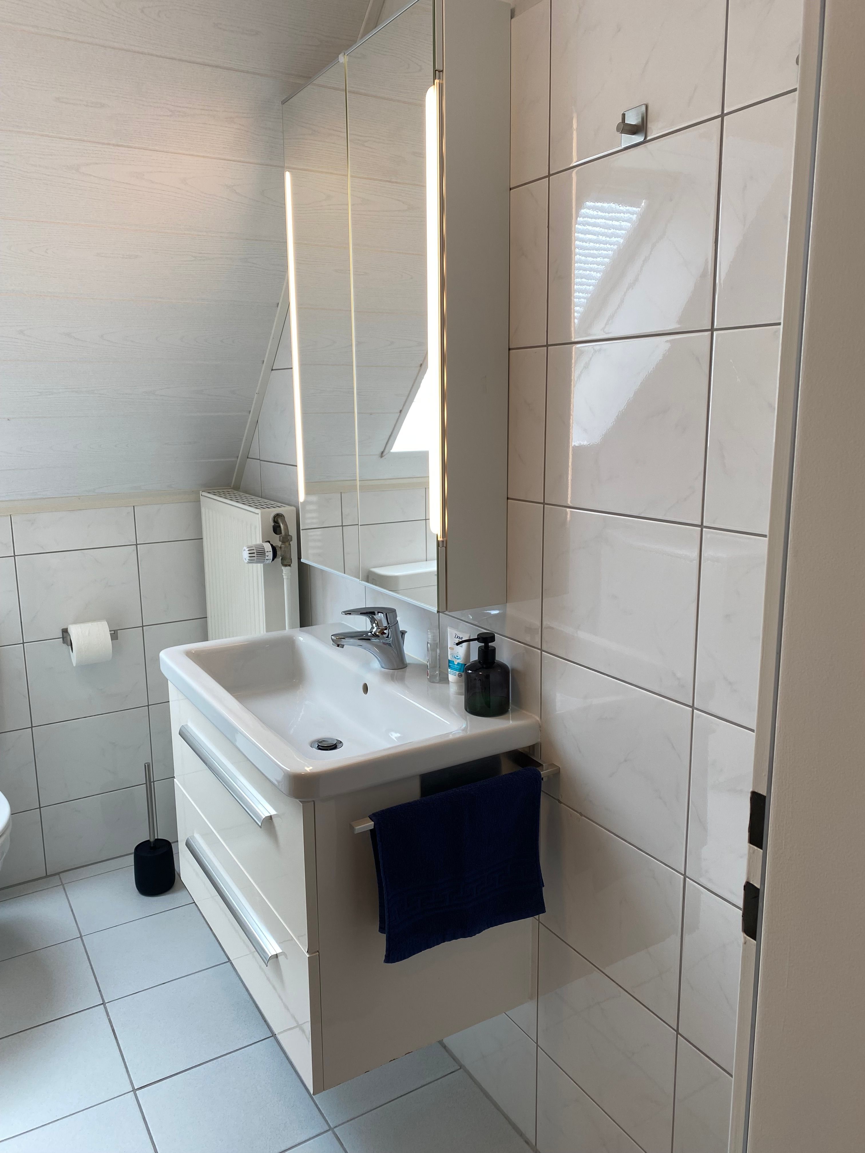 Die neue Küche ist ausgestattet mit allen notwendigen Geräten und Utensilien für den täglichen Bedarf und mit einem Frühstückstisch für zwei. Das Badezimmer mit Tageslicht verfügt über eine Dusche und Waschmaschine. Ein Abstellraum für Ihren Koffer, sowie eine Unterstellmöglichkeit für Fahrräder oder ähnliches ist vorhanden.