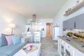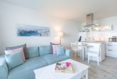 Darüber hinaus bietet der kombinierte Wohn- und Essbereich eine Küchenzeile mit Backofen und Geschirrspüler. Am 4-Zonen Ceranfeld können Sie selbst beim Kochen den atemberaubenden Ausblick genießen. Eine Kaffeemaschine, Wasserkocher und weitere Küchenutensilien sind ebenfalls vorhanden.