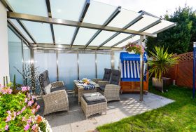 Higlight ist der kleine zugehörige Gartenbereich. Eingerahmt von einer großzügigen Terrasse mit einem Glasdach bietet dieser Teil Entspannung pur nach einem ausgiebigen Tag am Strand. Bequeme Rattansessel, ein großer Esstisch und sogar ein eigener Strandkorb stehen hier für Sie bereit.