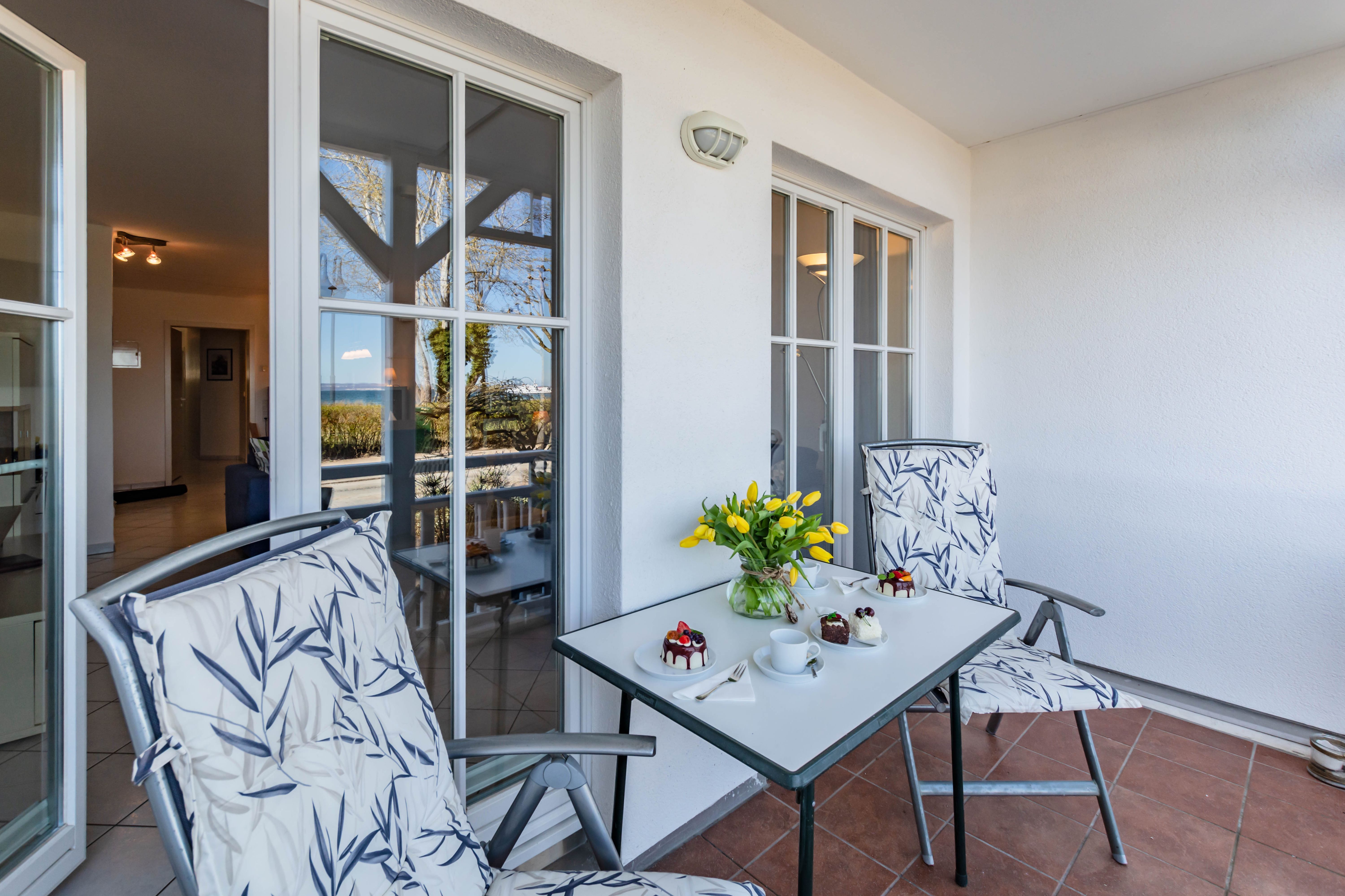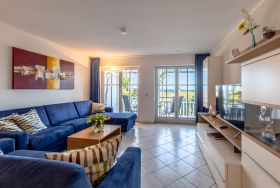 Das Appartment befindet sich im Erdgeschoss und hat einen Balkon mit direktem Meerblick.