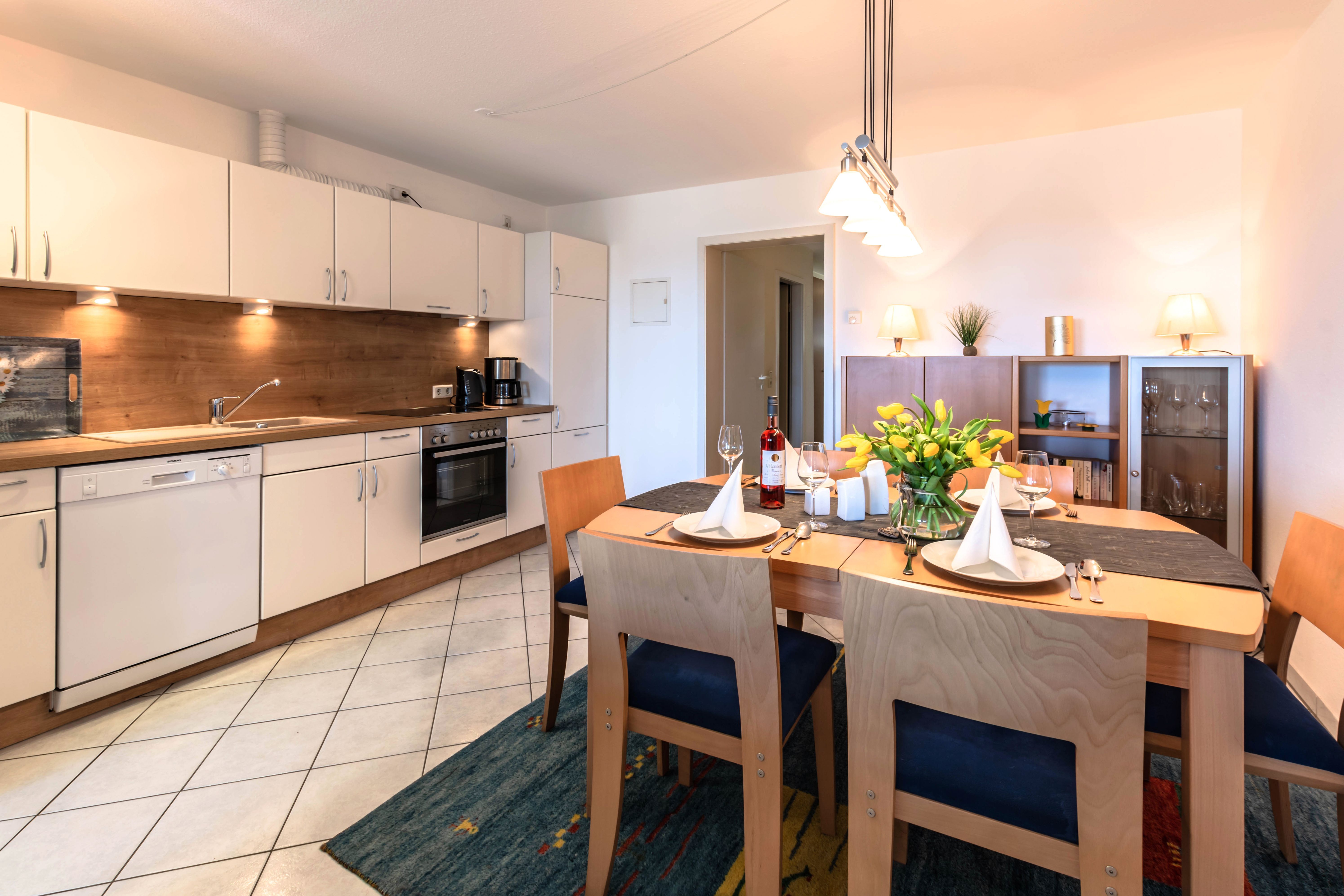 Die offene Küchenzeile ist komplett ausgestattet mit Geschirrspüler, Ceran-Back-Herd, Mikrowelle und weiteren nützlichen Geräten wie Kaffeemaschine, Toaster, Wasserkocher etc. und lädt zu gemeinsamen Kochen ein.