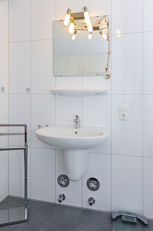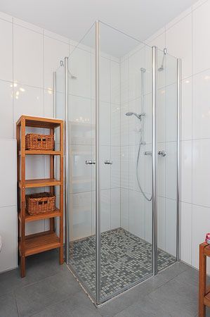 Badezimmer mit Dusche, Waschtisch und WC
