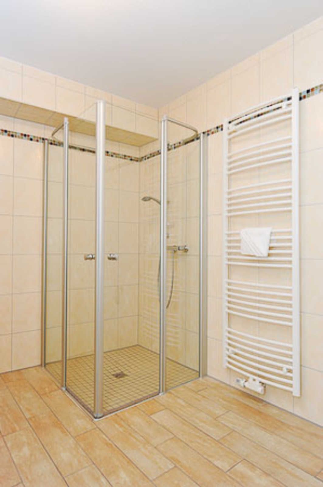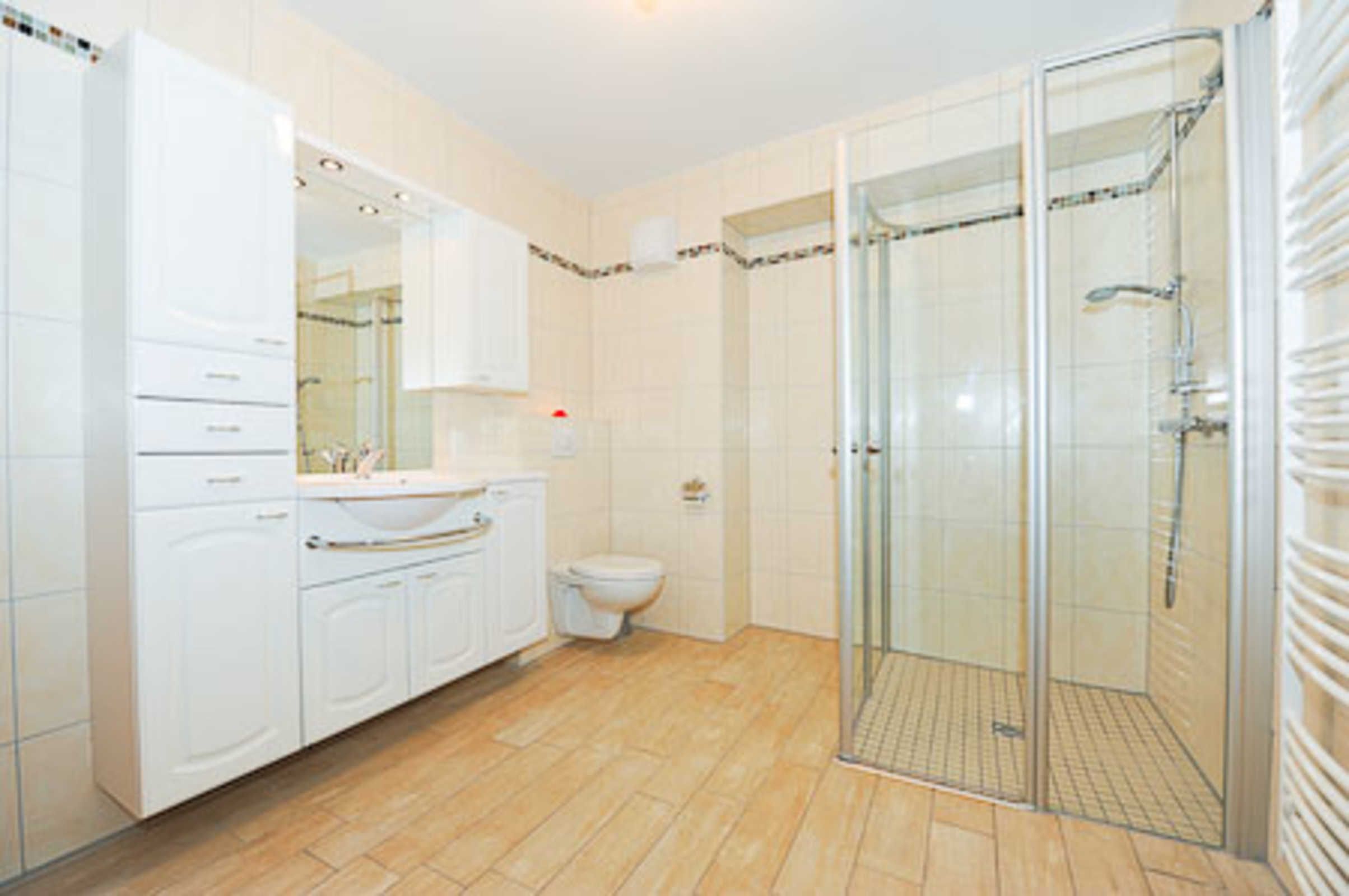 Badezimmer mit Dusche, Waschtisch und WC