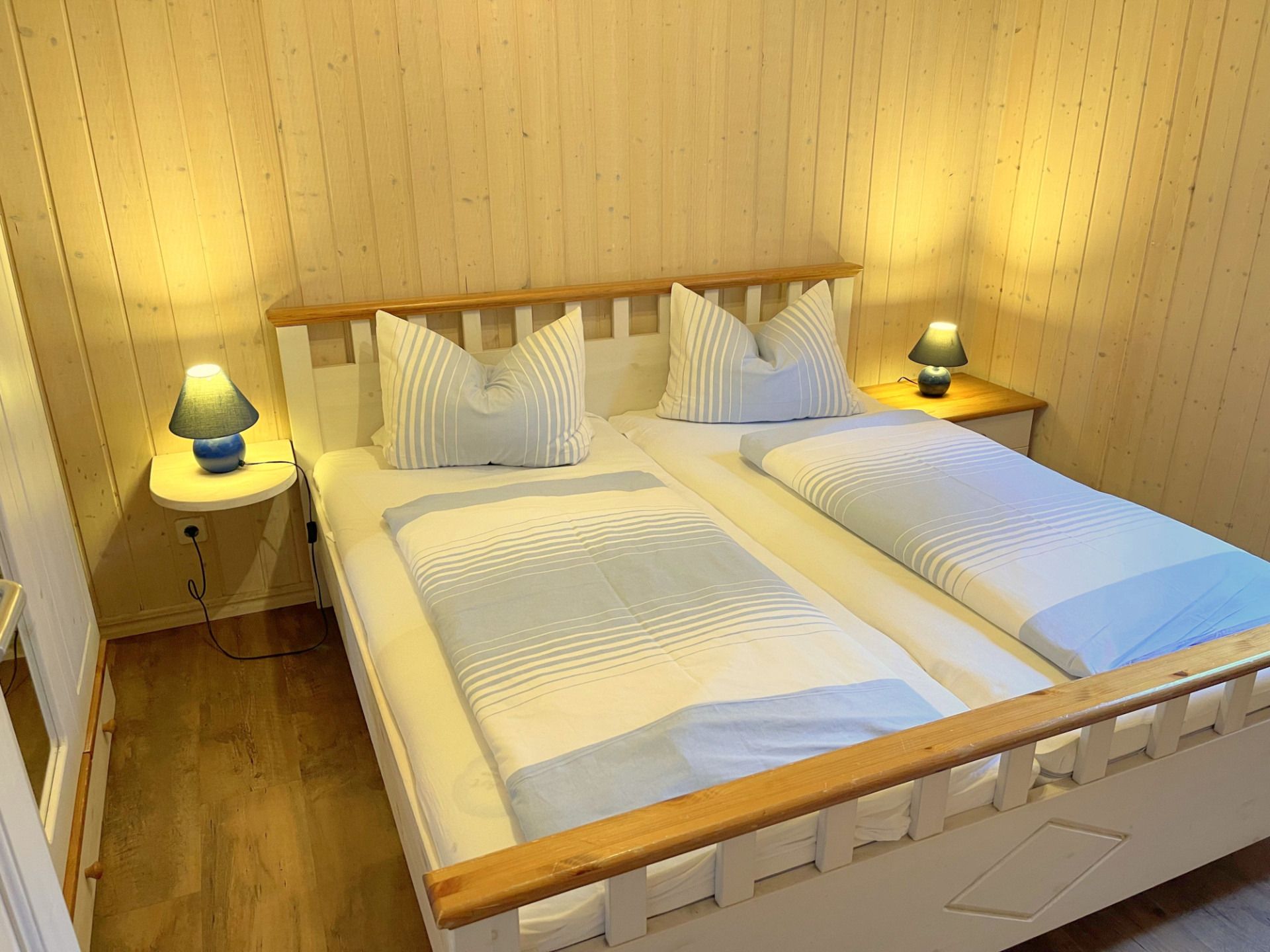 Das zweite Schlafzimmer befindet sich im Obergeschoss mit zwei Einzelbetten.