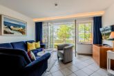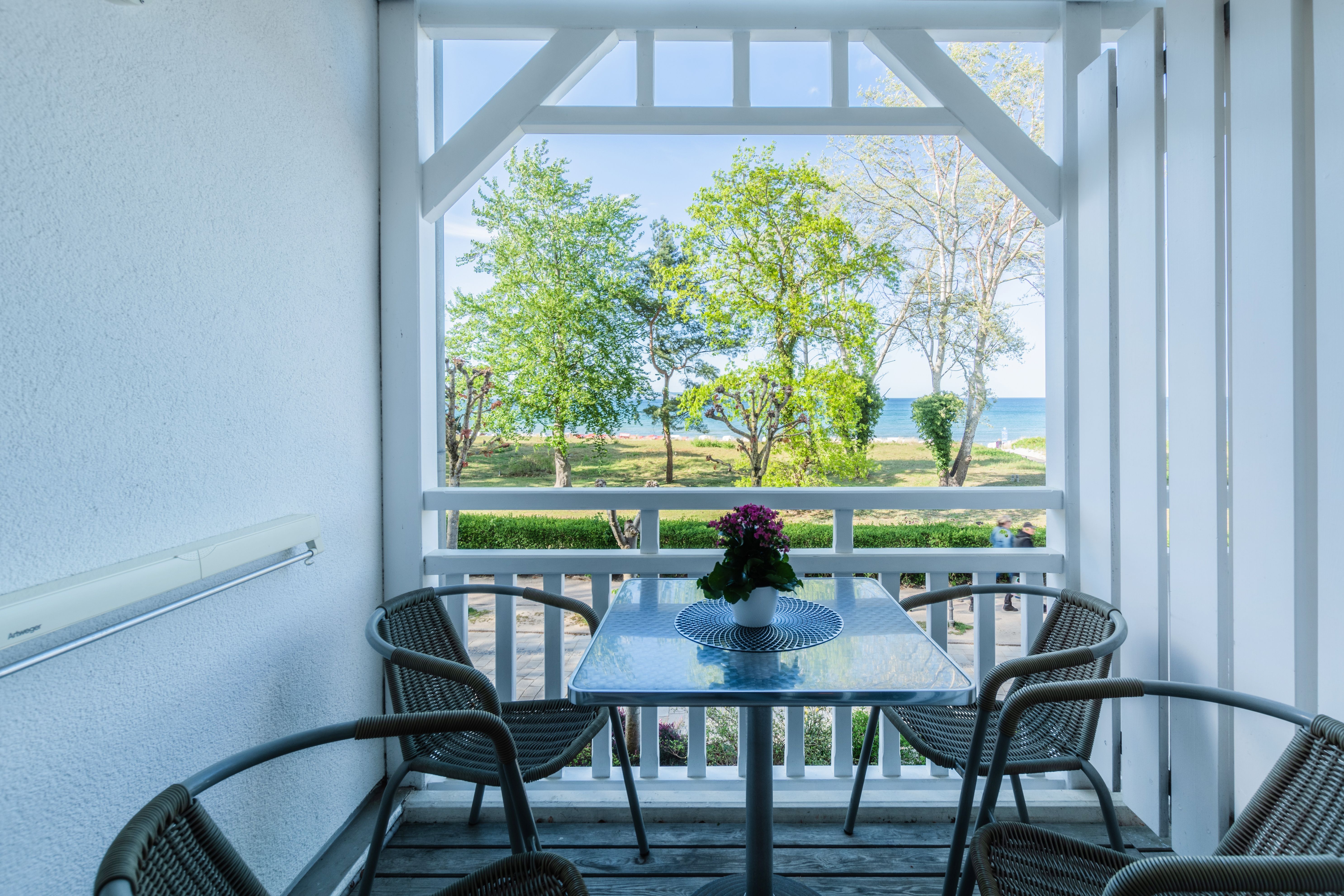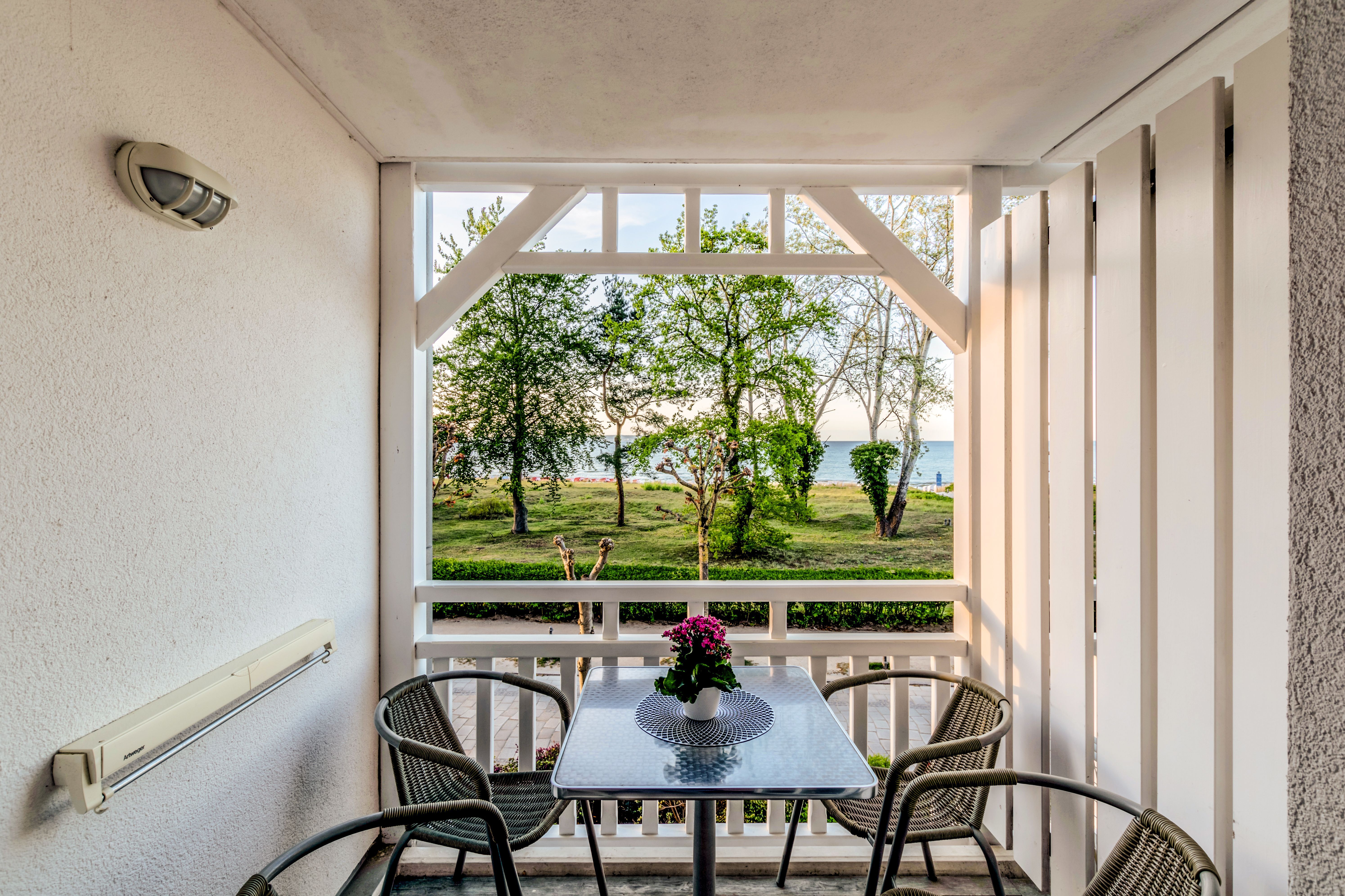 Das idyllisch eingerichtete 2-Raumappartment ist ca. 50 m² groß und befindet sich im 1. Obergeschoss und verfügt über einen großen Balkon mit direktem Meerblick.