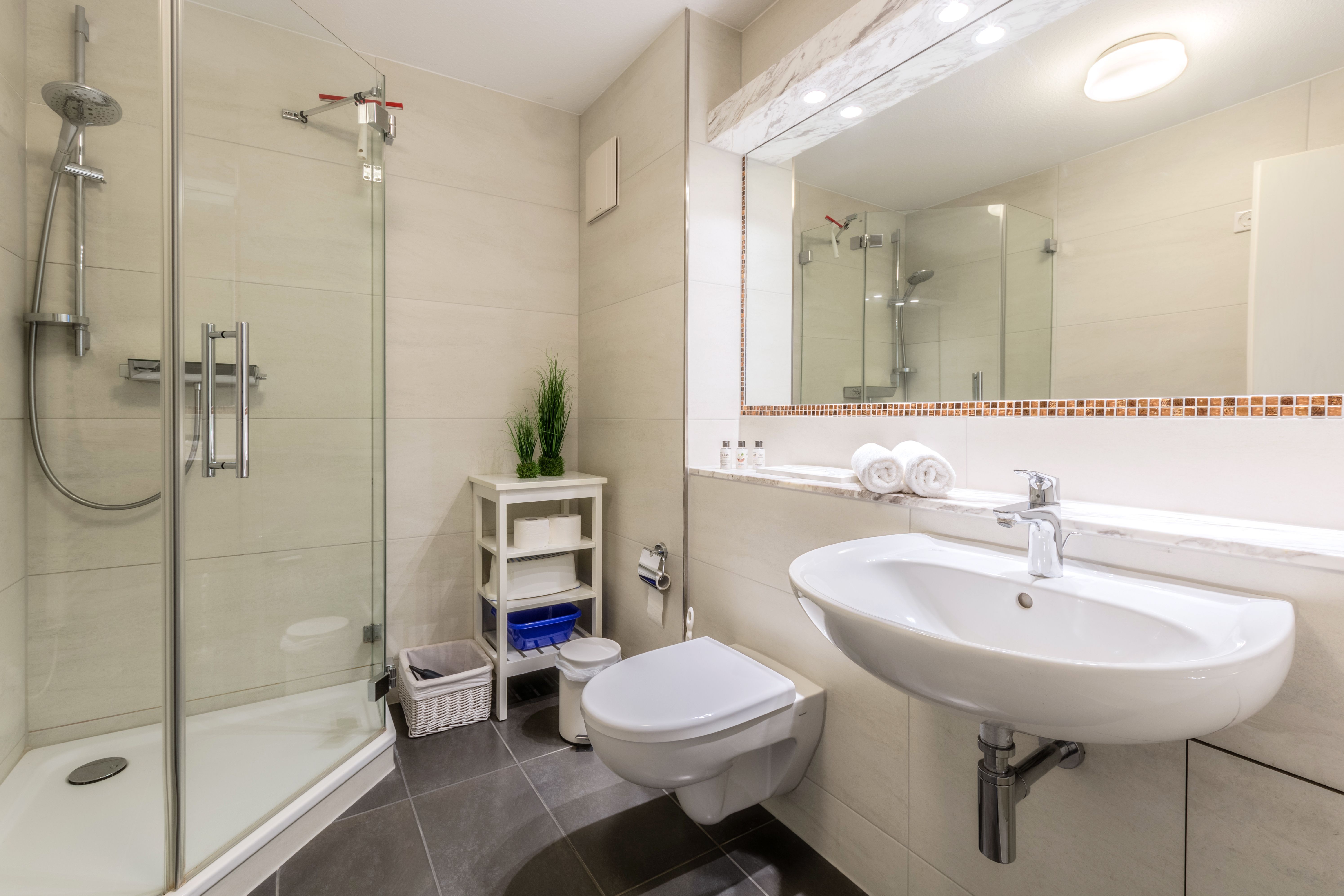 Das helle Badezimmer verfügt über eine Dusche und ein Fön ist ebenfalls vorhanden.