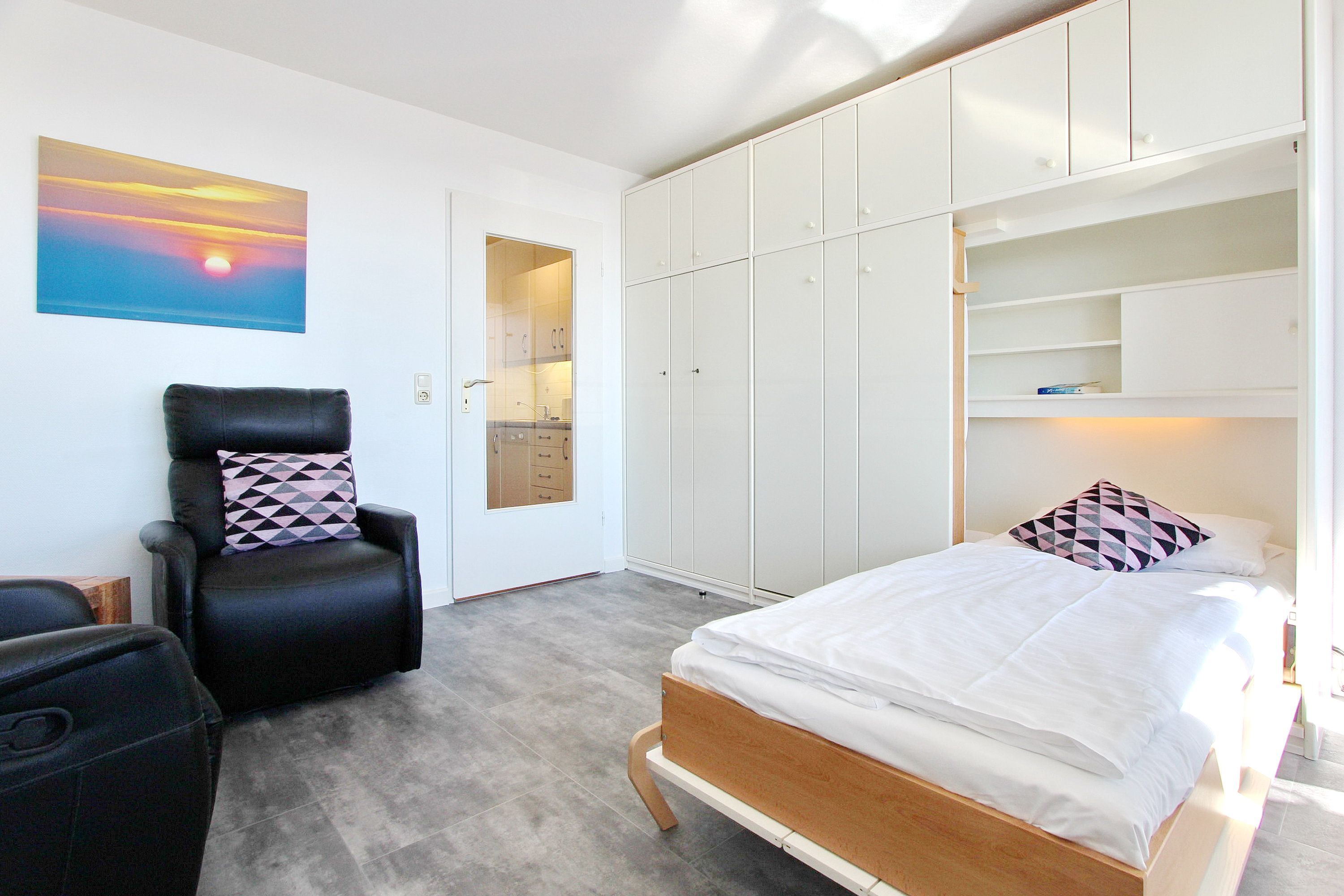 Gepflegte 1-Zimmer-Wohnung im Herzen von Westerland - sie befindet sich in der 13. Etage im Kurzentrum von Westerland mit herrlichem Weitblick über die City bis hin zum Wattenmeer. Auf dem vorgelagertem Ost-Balkon können Sie ungehindert den Sonnenaufgang genießen. Das Schwimmbad Sylter Welle, der Hauptstrand und die beiden Fußgängerzonen befinden sich in unmittelbarer Nähe. Der kombinierte Wohn-/Schlafraum verfügt über 2 Einzel-Schrankbetten, 2 gemütlichen Sesseln und einem Essplatz mit 2 Stühlen. In der, im Vorflur befindlichen, Küche finden Sie eine Geschirrspülmaschine, ein Ceran-Kochfeld mit 2 Platten, eine Mikrowelle und ein Kühlschrank mit Gefrierfach. Helles Duschbad/WC mit Handtuchheizkörper. Nichtraucherwohnung. Haustiere nicht gestattet. Wohnungsgröße ca. 30 m². Ein Hotspot im Haus (WEG Haus Metropol - Passwortfrei - ohne Gewähr) ermöglicht Ihnen einen kabellosen und kostenfreien Zugang zum Internet.