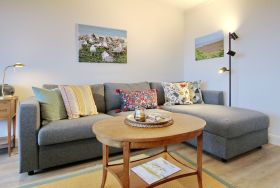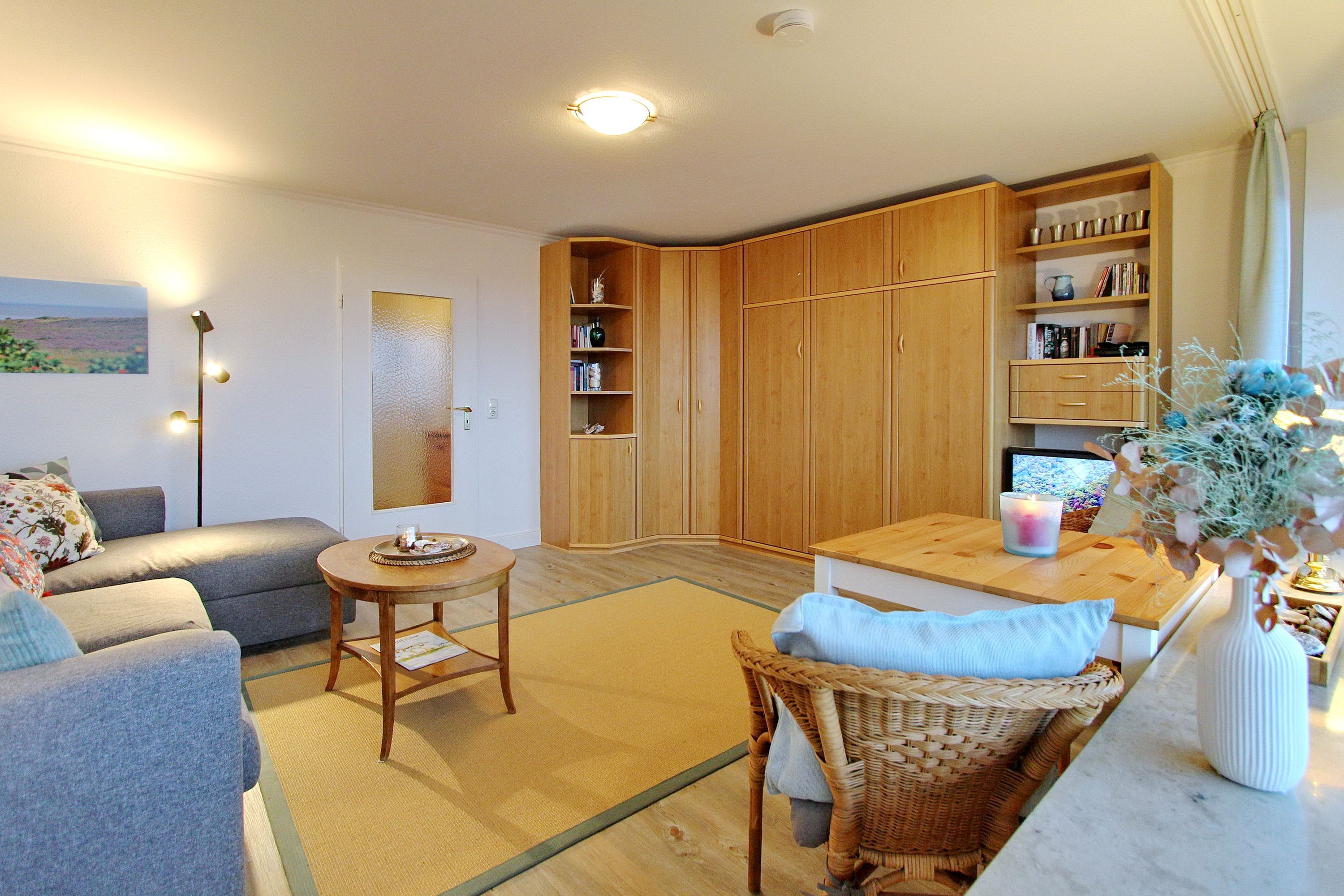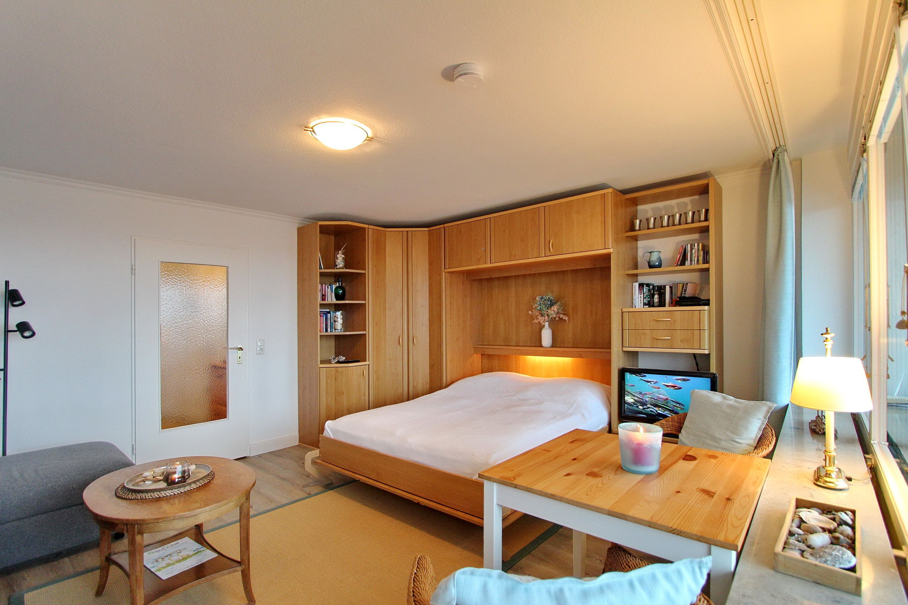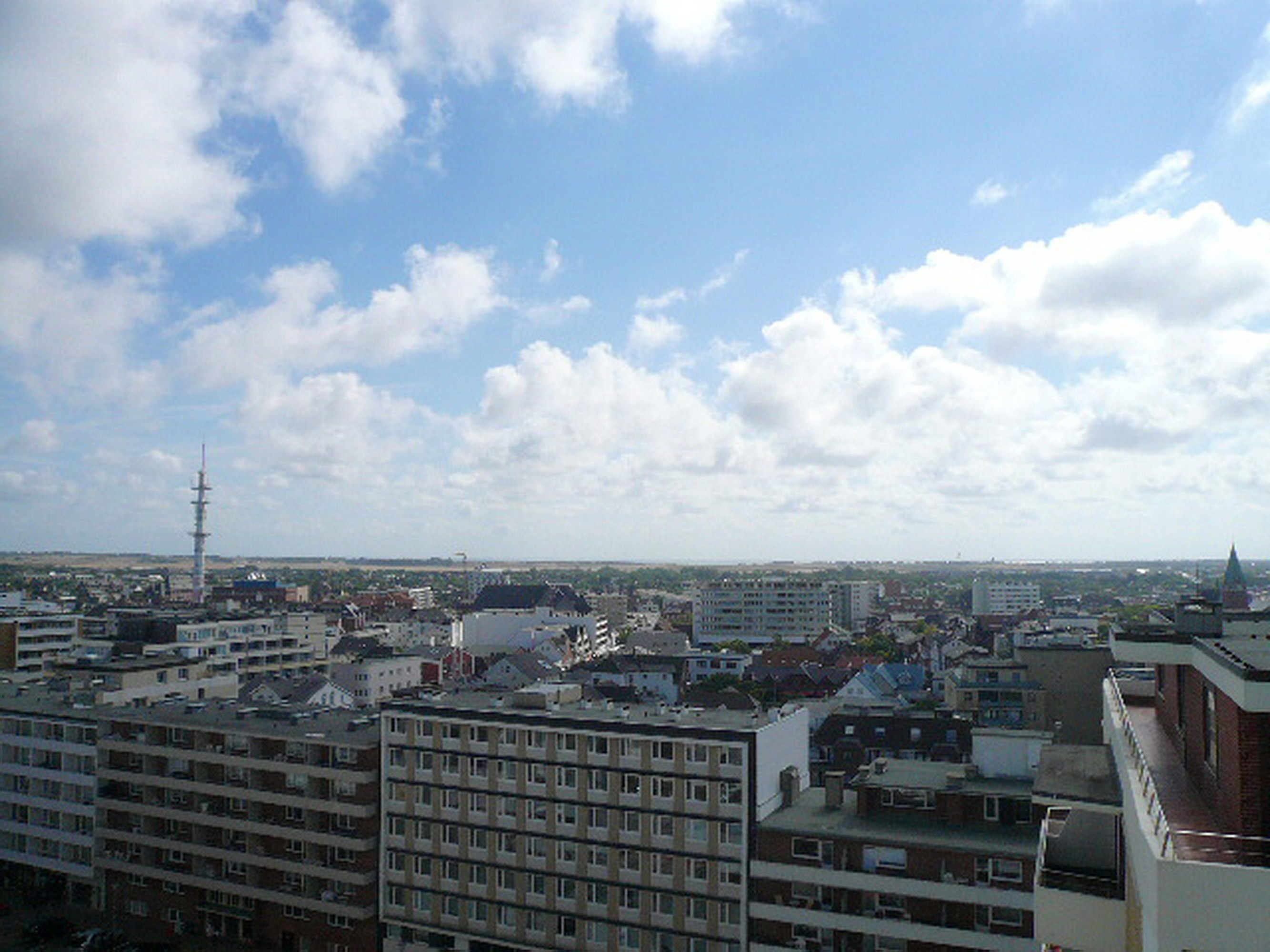 Geschmackvoll eingerichtete Einzimmerwohnung in der 10. Etage im Haus Metropol im Herzen der Inselmetropole Westerland. Vom vorgelagertem Ostbalkon haben Sie einen traumhaften Blick über die Insel und bei guter Sicht bis zum Festland. Der kombinierte Wohn-/Schlafraum ist mit einem Doppelschrankbett, einer gemütlichen Eckcouchgarnitur und einem Essplatz am Fenster ausgestattet. In der separaten Küche finden Sie einen Herd mit 4 Cerankochfeldern und Backofen und einen Kühlschrank mit Gefrierfach vor. Das moderne Badezimmer verfügt über eine Eckdusche mit WC und einem Handtuchheizkörper. Zur technischen Ausrüstung gehört ein Flachbild-TV, Radio und ein DVD-Player. Nichtraucherwohnung. Das freie WLAN-Netzwerk (WEG Haus Metropol - Passwortfrei - ohne Gewähr) steht ihnen kostenfrei zur Verfügung. Wohnungsgröße ca. 38 m².