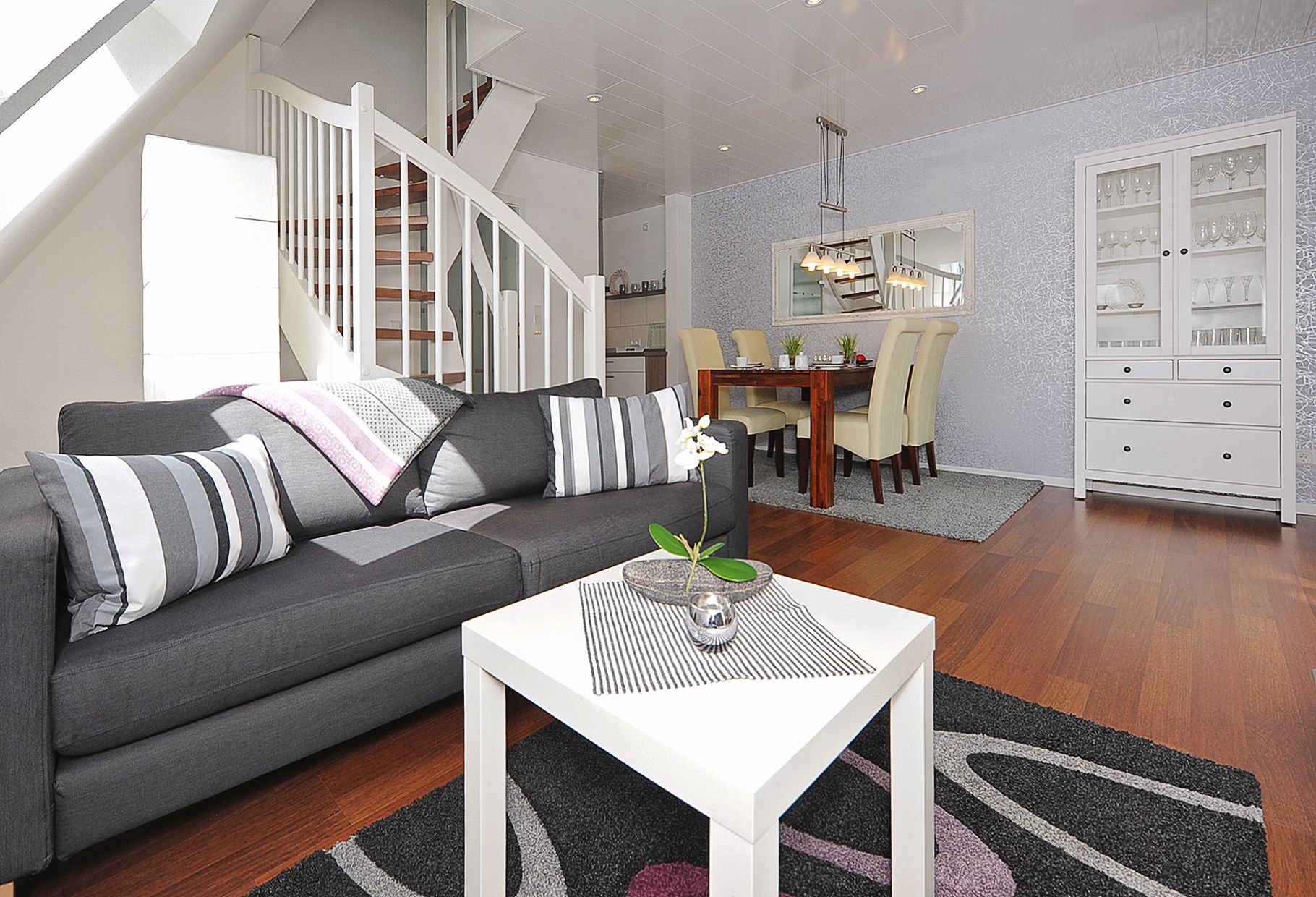 Größe ca. 65 Quadratmeter, Wohnraum mit integrierter Küche, Schlafzimmer, zweites separates Schlafzimmer/Kinderzimmer, Badezimmer mit Dusche, Waschtisch und WC, Erdgeschoss, Obergeschoss, Terrasse, Koffer-/Abstellraum, optimal für 1 bis 3 Personen und zusätzlich ein Kleinkind.