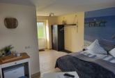 Das Doppelzimmer verfügt über ein Boxspringbett, das wahlweise als Doppelbett oder zwei Einzelbetten gestellt werden kann. Es gibt ein Duschbad/WC und ein kleines Küchenregal mit Wasserkocher, Minikühlschrank und Geschirr.