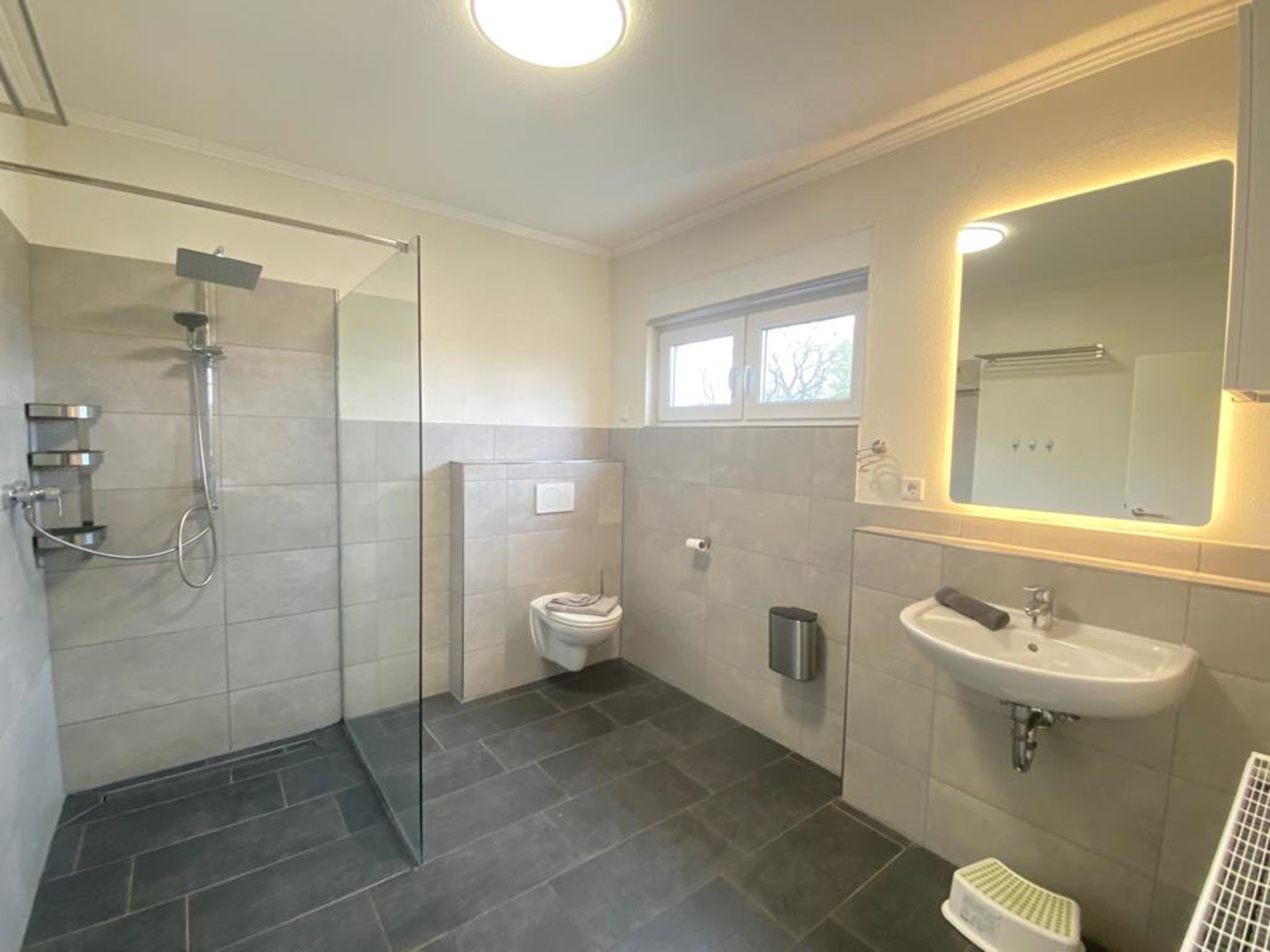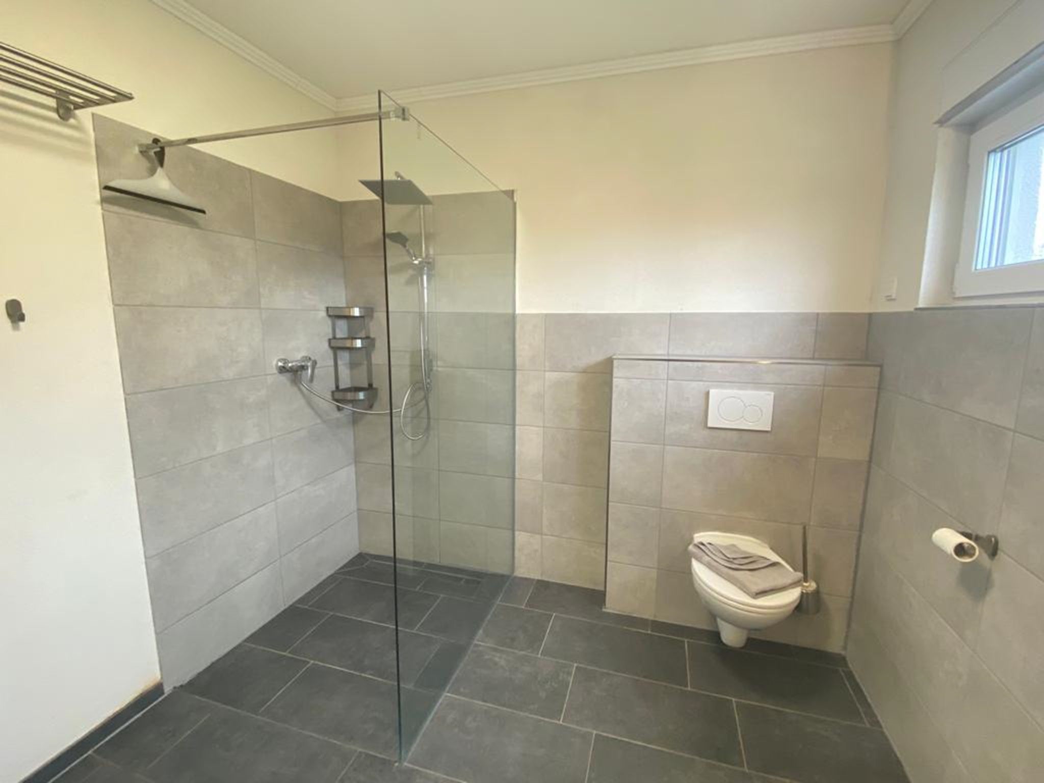 Das schicke Fenster-Duschbad hat eine begehbare Dusche.