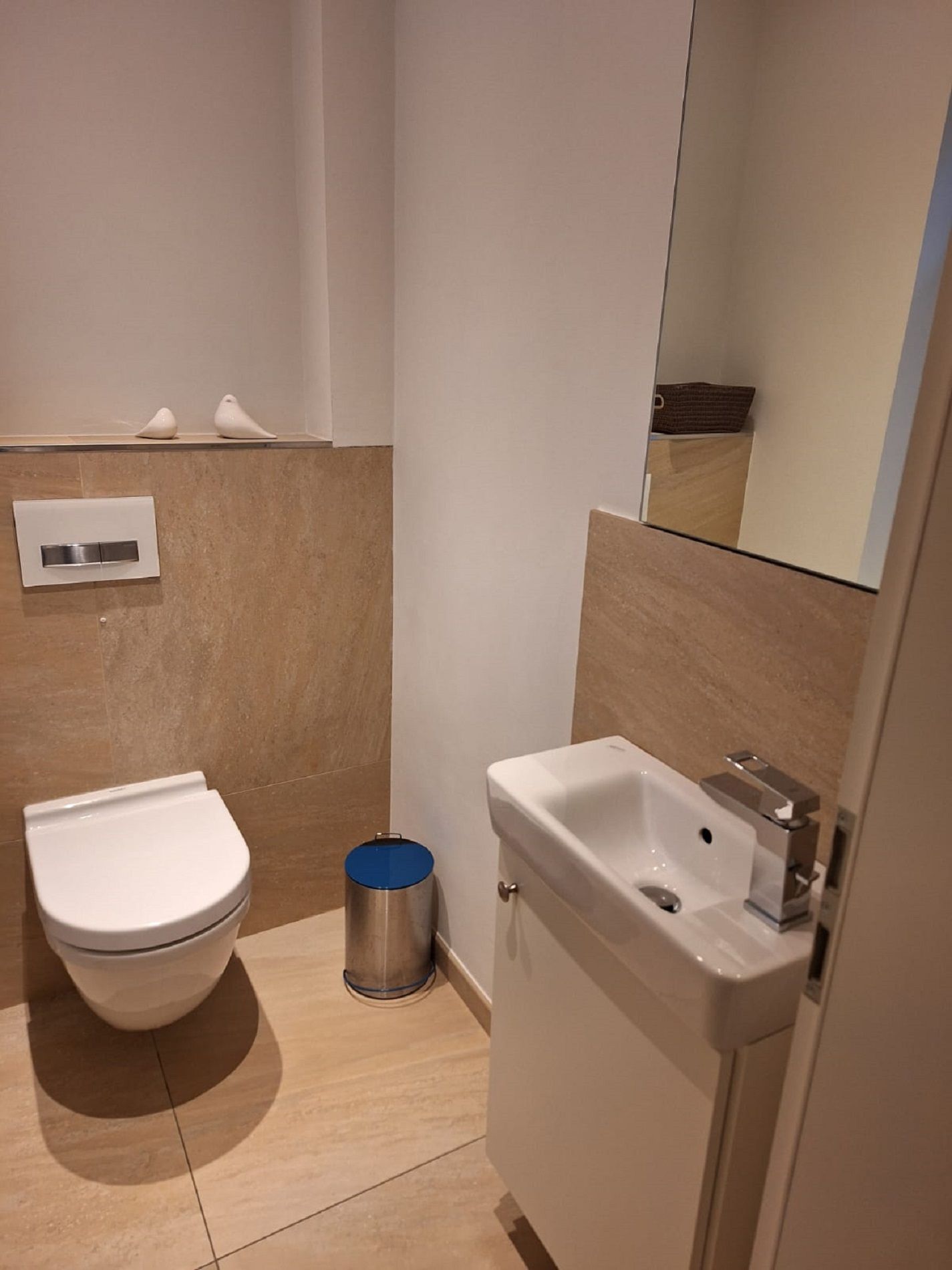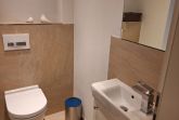 Das neue Bad lässt mit moderner Regendusche, Fön, Kosmetikspiegel, Waschtisch, Handtuchwärmer und WC keine Wünsche offen.