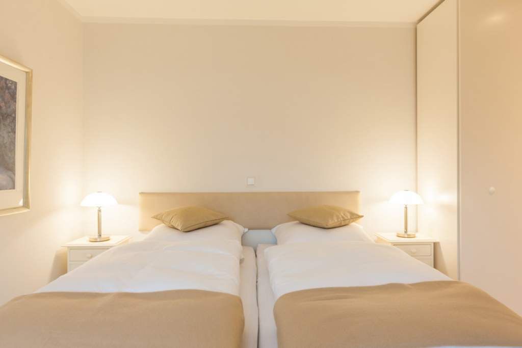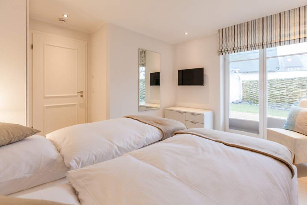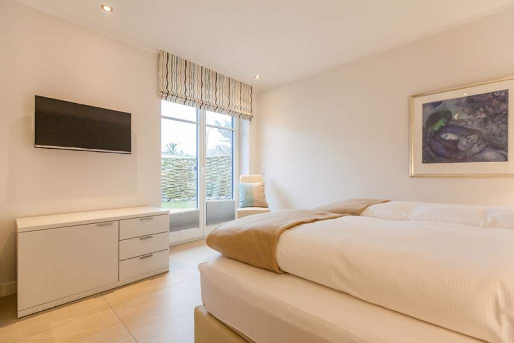 Im Erdgeschoss befindet sich außerdem das barrierefrei begehbare Doppel-Schlafzimmer mit Boxspringbett (Einzelmatratzen 0,90 x 2,00 m) in optimaler Liegehöhe (Kinderzustellbett mögl.), mit weiterem Flachbild-TV und Zugang zur zweiten nach Südosten ausgerichteter Terrasse mit kleinem Garten.