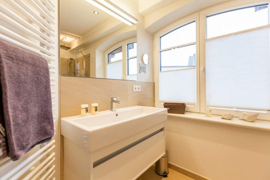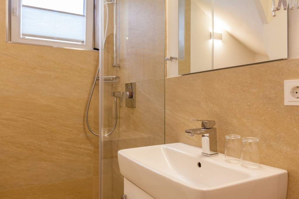 Das zweite Bad hat eine moderne Regendusche, Fön, Kosmetikspiegel, Waschtisch, Handtuchwärmer und ein WC.