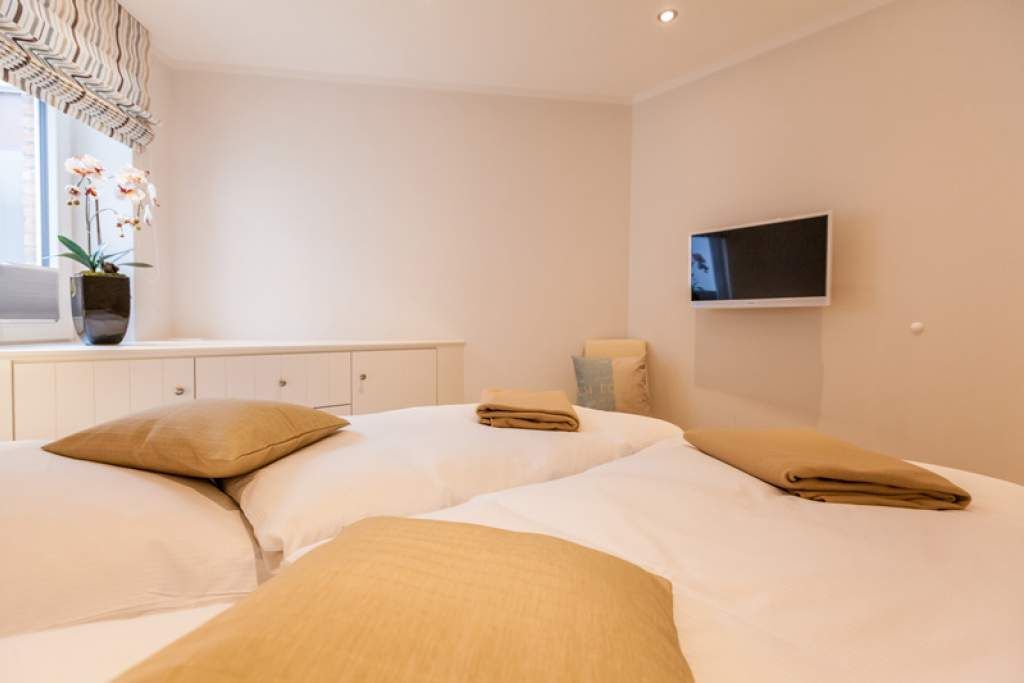 Im Untergeschoss befindet sich ein weiteres, kleines Doppel-Schlafzimmer mit Boxspringbett (Einzelmatratzen 0,80 x 2,00 m) in optimaler Liegehöhe und ein weiterer Flachbild-TV.
