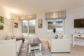 Luxuriöse 2-Zimmer-Nichtraucher-Ferienwohnung auf einer Ebene (barrierefrei), ca. 58 qm im Erdgeschoss mit Südostterrasse mit Strandkorb und kleinem Garten für 2 Personen