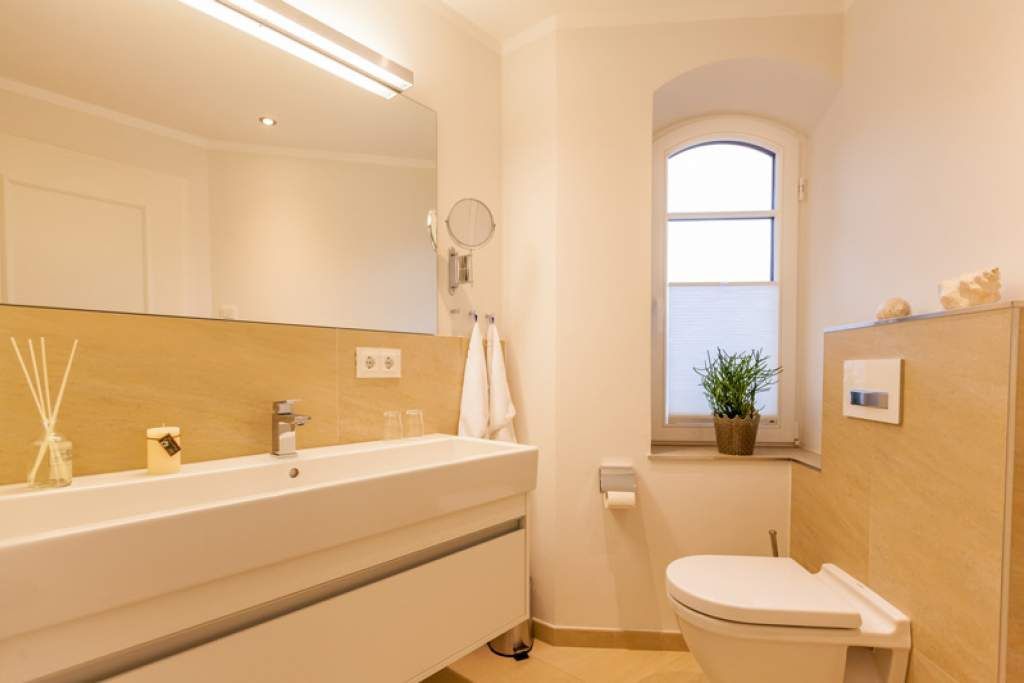 Das neue Bad lässt mit moderner Regendusche, Fön, Kosmetikspiegel, Waschtisch, Handtuchwärmer und WC keine Wünsche offen.