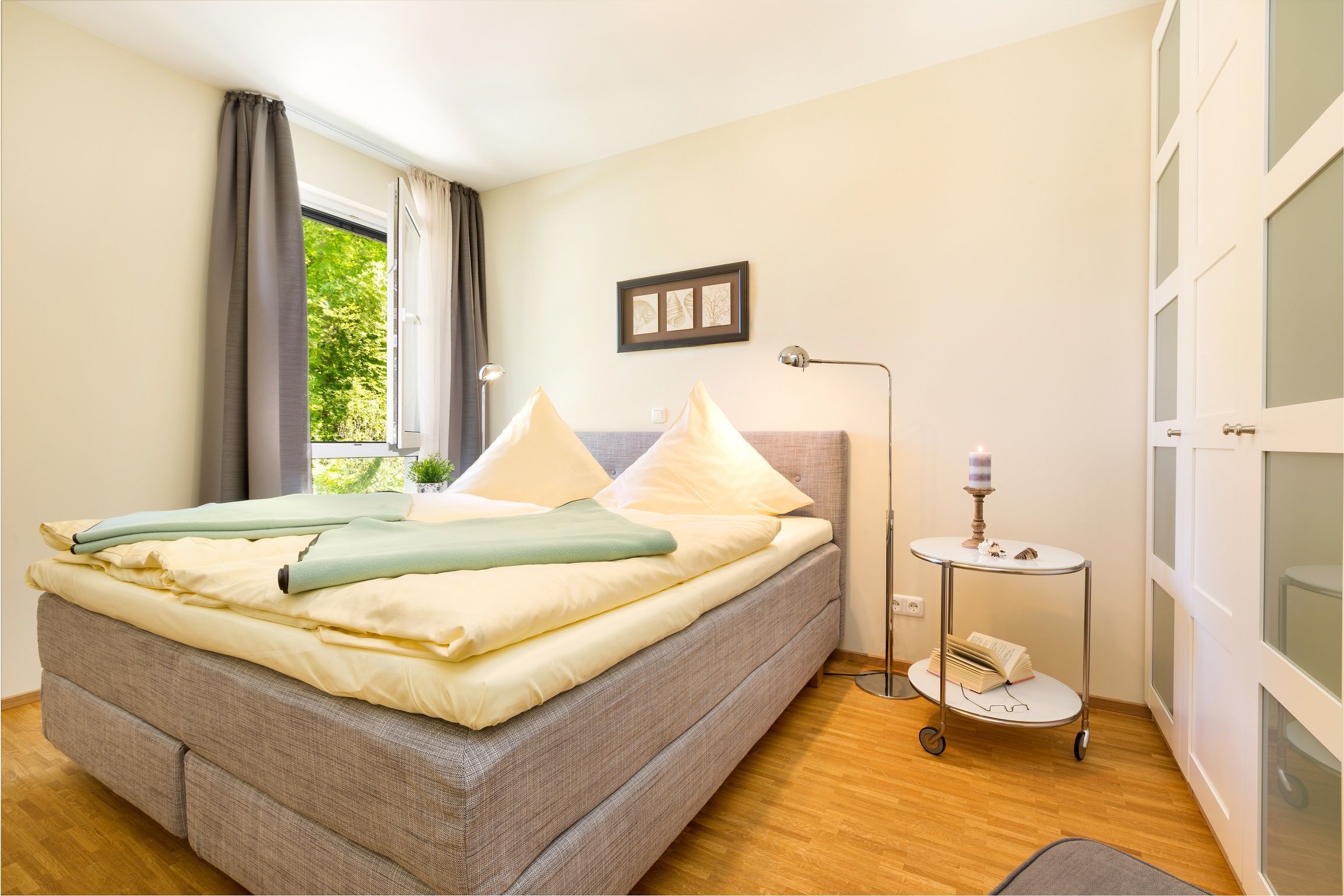 Das haustierfreie 2-Raum-Appartement befindet sich im 1. Obergeschoss und verfügt über einen überdachten Balkon. Der helle Schlafraum ist mit Doppelbett und Allergiker freundlichen und klimaregulierenden Matratzen ausgestattet.