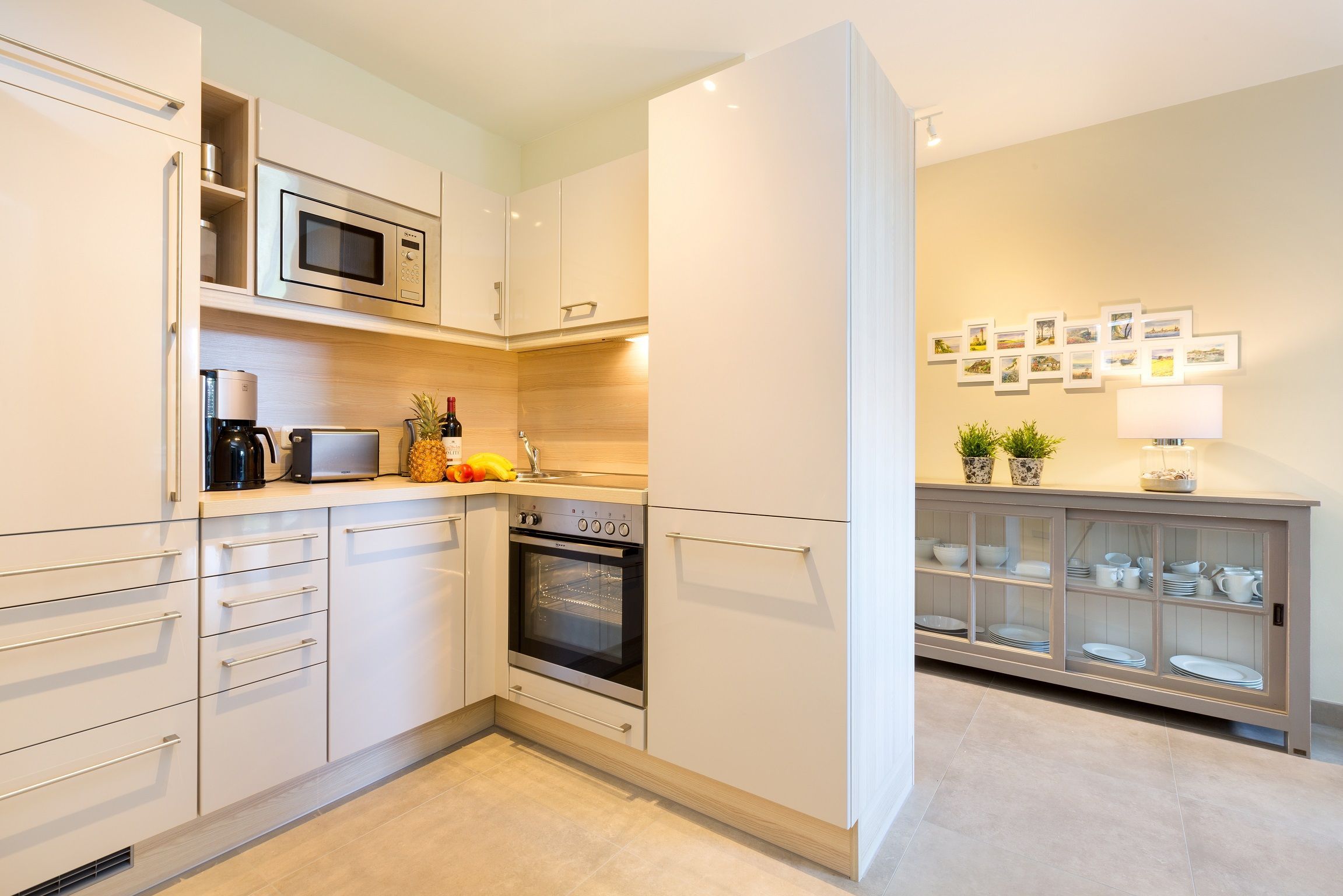 Die Einbauküche ist mit Cerankochfeld, Backherd, Geschirrspüler, Mikrowelle, Nespresso Kapselmaschine von der Firma „DeLonghi“ und weiteren nützlichen Geräten wie Kaffeemaschine, Toaster, Wasserkocher etc. ausgestattet.