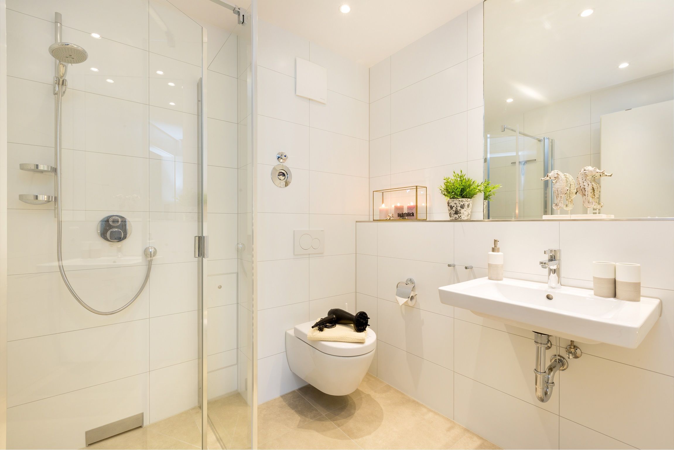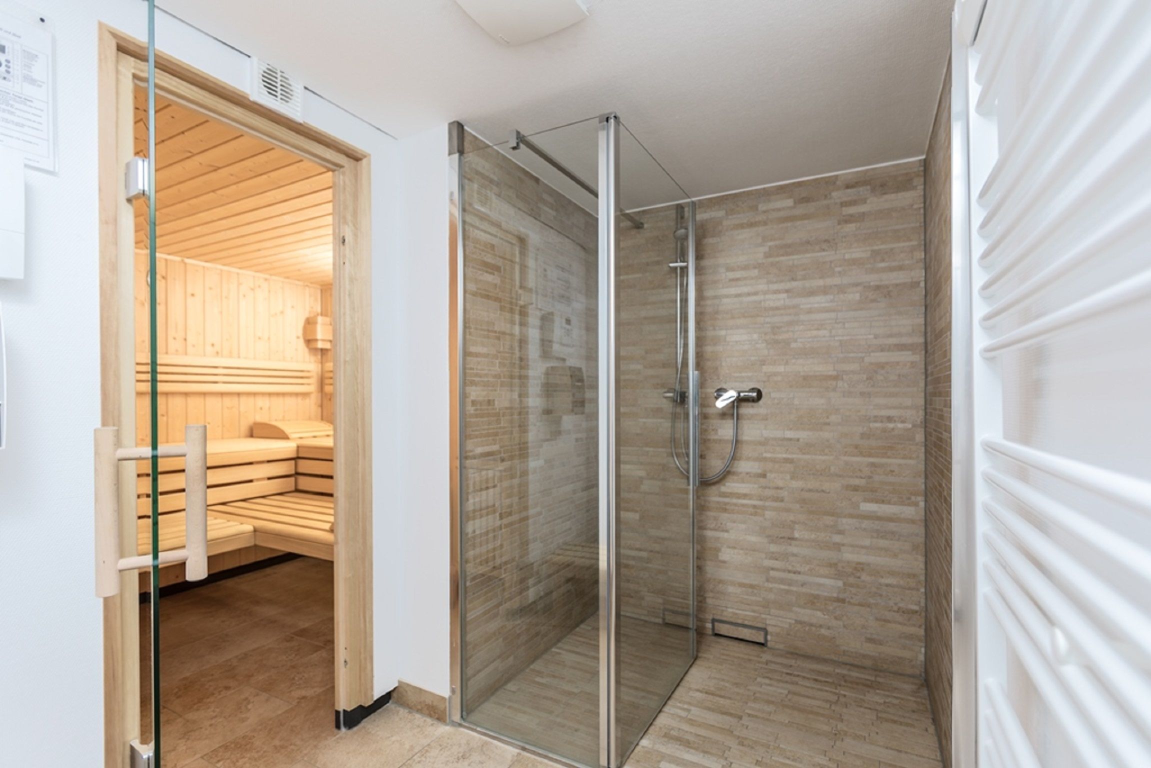 Das Bad verfügt über eine ebenerdige Dusche. Safe und ein Fön gehören ebenfalls zur Ausstattung des Appartments.