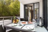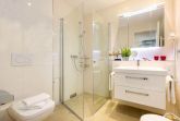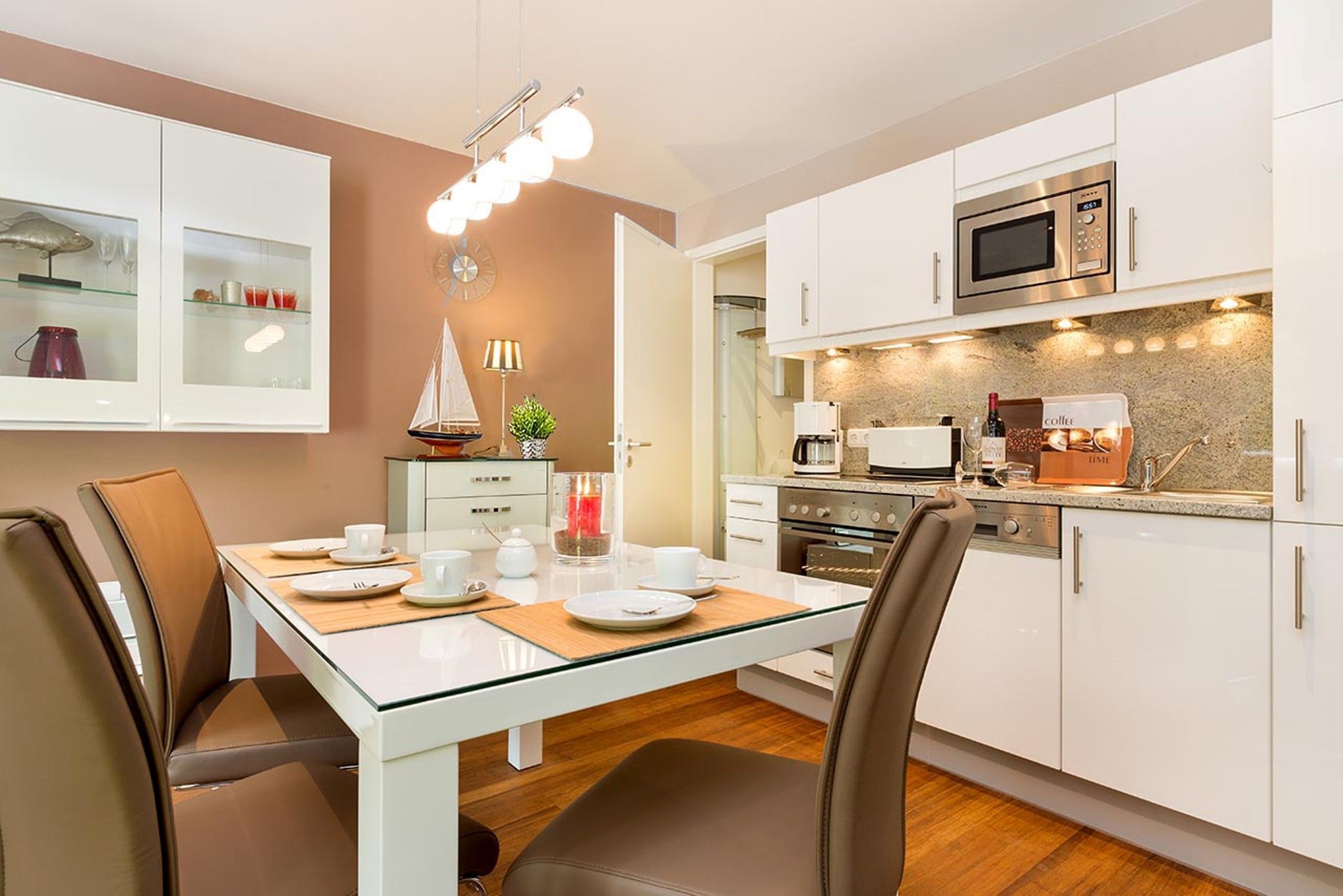 Die offen gestaltete Einbauküche ist modern und bestens ausgestattet: Cerankochfeld, Backofen, Geschirrspüler, Mikrowelle sowie eine Kaffeemaschine sorgen für kulinarischen Komfort. Im stilvollen Badezimmer erwartet Sie eine bodengleiche Dusche, ein Föhn liegt ebenfalls für Sie bereit.