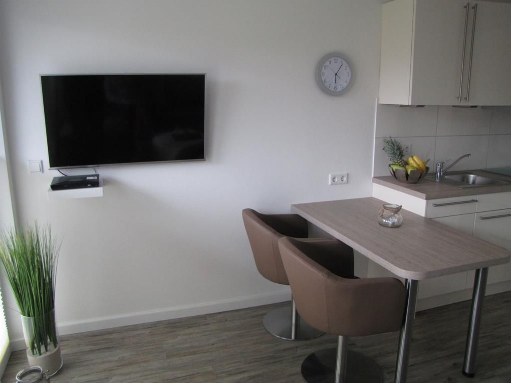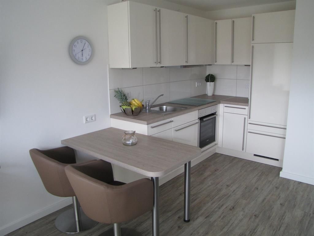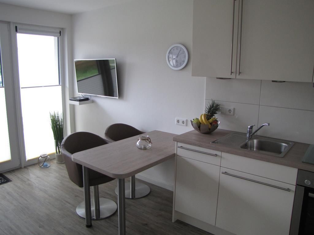 Die Ferienwohnung liegt in einem im Jahre 2014 errichteten Appartementhaus und ist geschmackvoll eingerichtet. Über den Flur, der mit Garderobenmöbeln ausgestattet ist, erreichen Sie Wohn-/Esszimmer, Schlafzimmer, Duschbad und Abstellraum. Das Wohn-/Esszimmer ist mit einer komplett ausgestatteten, modernen Küchenzeile versehen, an die eine Essecke angegliedert ist. Die gemütliche Sitzecke ist behaglich ausgestattet mit großem Flachbildschirm, DVD-/Blu-Ray-Player, bluetooth-fähiger Stereoanlage, Gesellschaftsspielen und Lesematerial. Aus dem Wohnzimmer haben Sie direkten Zugang zur möblierten Terrasse mit großzügigem Strandkorb (2,5-Sitzer), Gartenmöbeln und Grill. Das Schlafzimmer ist geräumig und besteht aus einem Doppelbett mit offenem Fußende, Nachttischen, großzügigem Kleiderschrank und einem Herrendiener zur Ablage von Kleidungsstücken. Im Badezimmer finden Sie neben Dusche, WC und verschiedenen Badmöbeln einen Fön und Badutensilien. Bügeleisen und Bügelbrett befinden sich im Abstellraum. Für Kleinkinder ist ein Kinderreisebett und Hochstuhl kostenfrei verfügbar, welches für Sie im Keller bereit steht.
