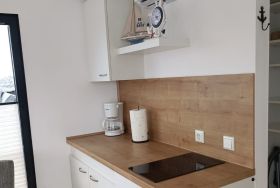Mikrowelle, Spülmaschine, Kühlschrank mit Gefrierfach, Ceranfeld (2-flammig), Kaffeemaschine, Toaster, Wasserkocher, Spüle