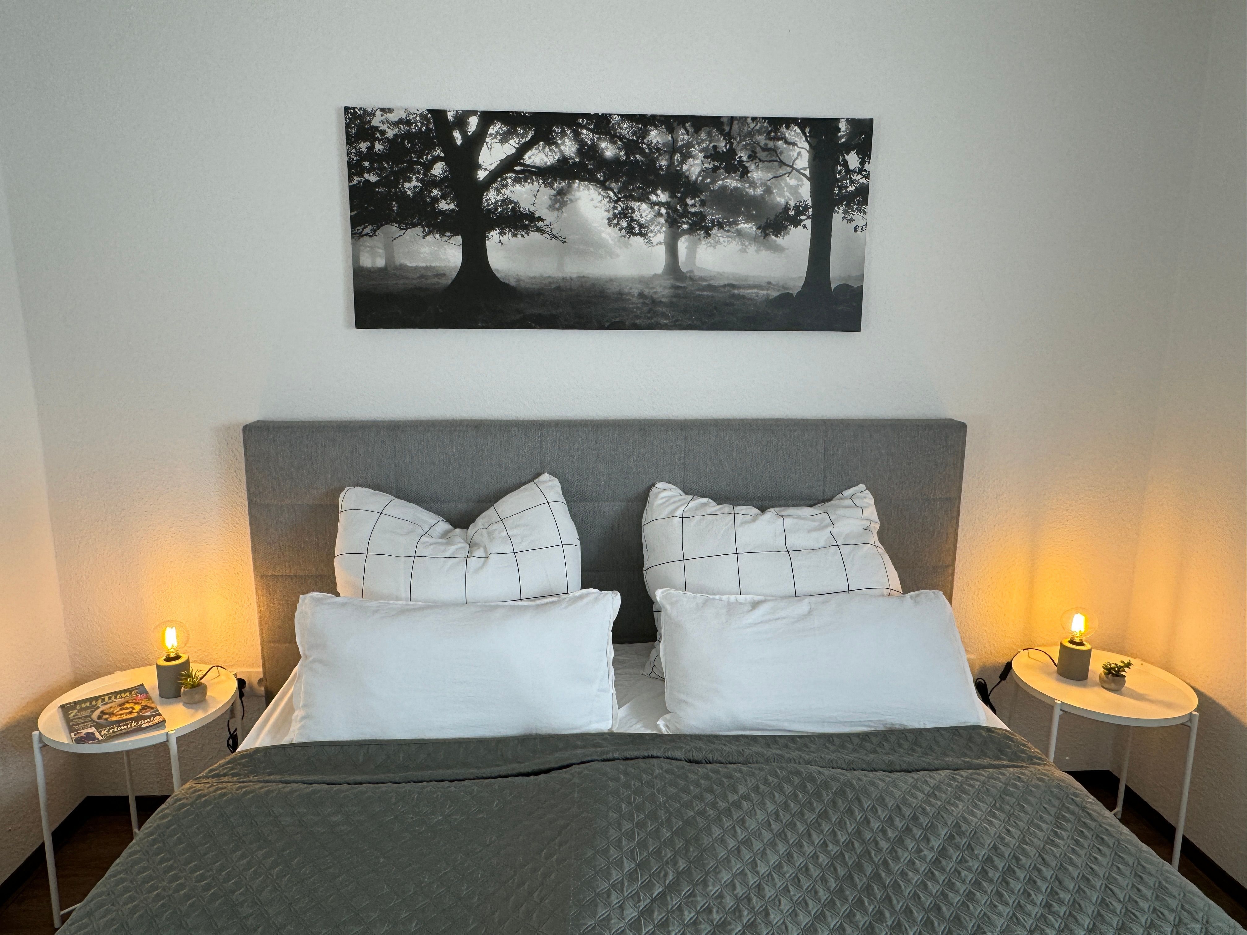Im Schlafzimmer erwartet Sie ein Boxspringbett und genügend Stauraum für Ihre Kleidung.