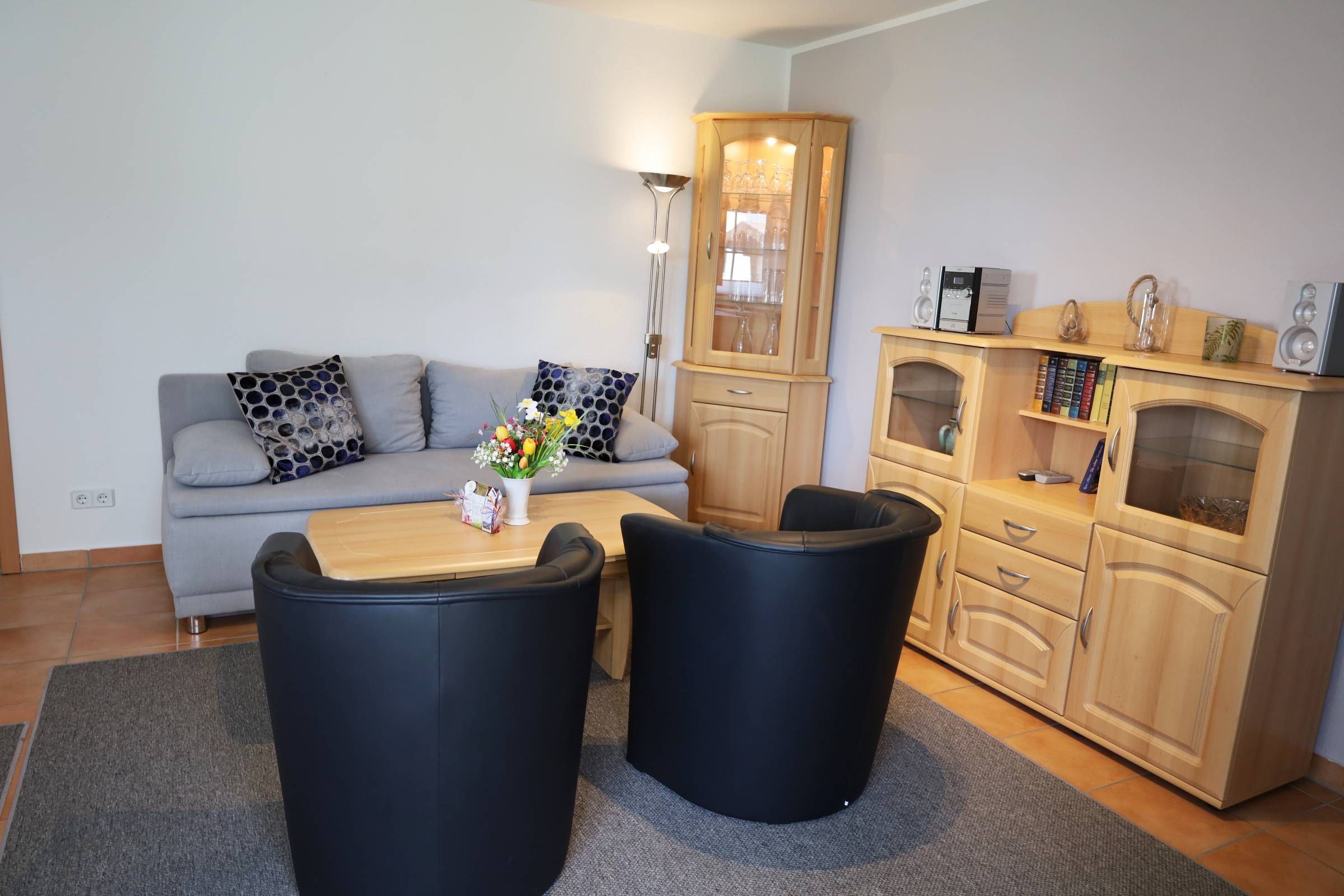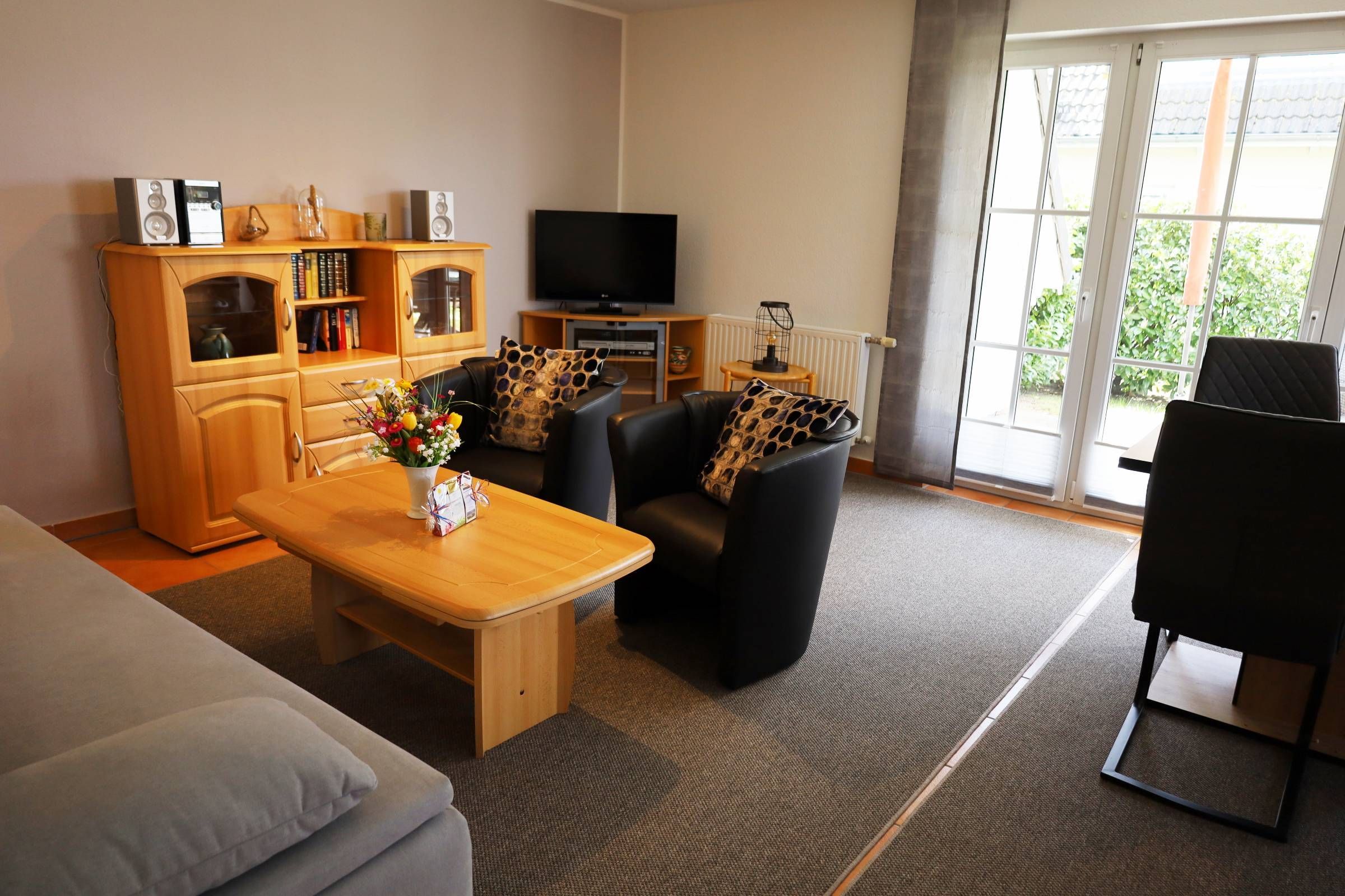 Die ca. 52 m² 2-Raum-Wohnung befindet sich im Erdgeschoß und ist eine Nichtraucherwohnung. Ein großräumiges Wohnzimmer mit gemütlichem Schlafsofa (Aufbettung für die 3. und 4. Person) und Sesseln bietet ausreichend Platz, Flachbildfernseher sowie Hifi-Anlage sind ebenfalls vorhanden.