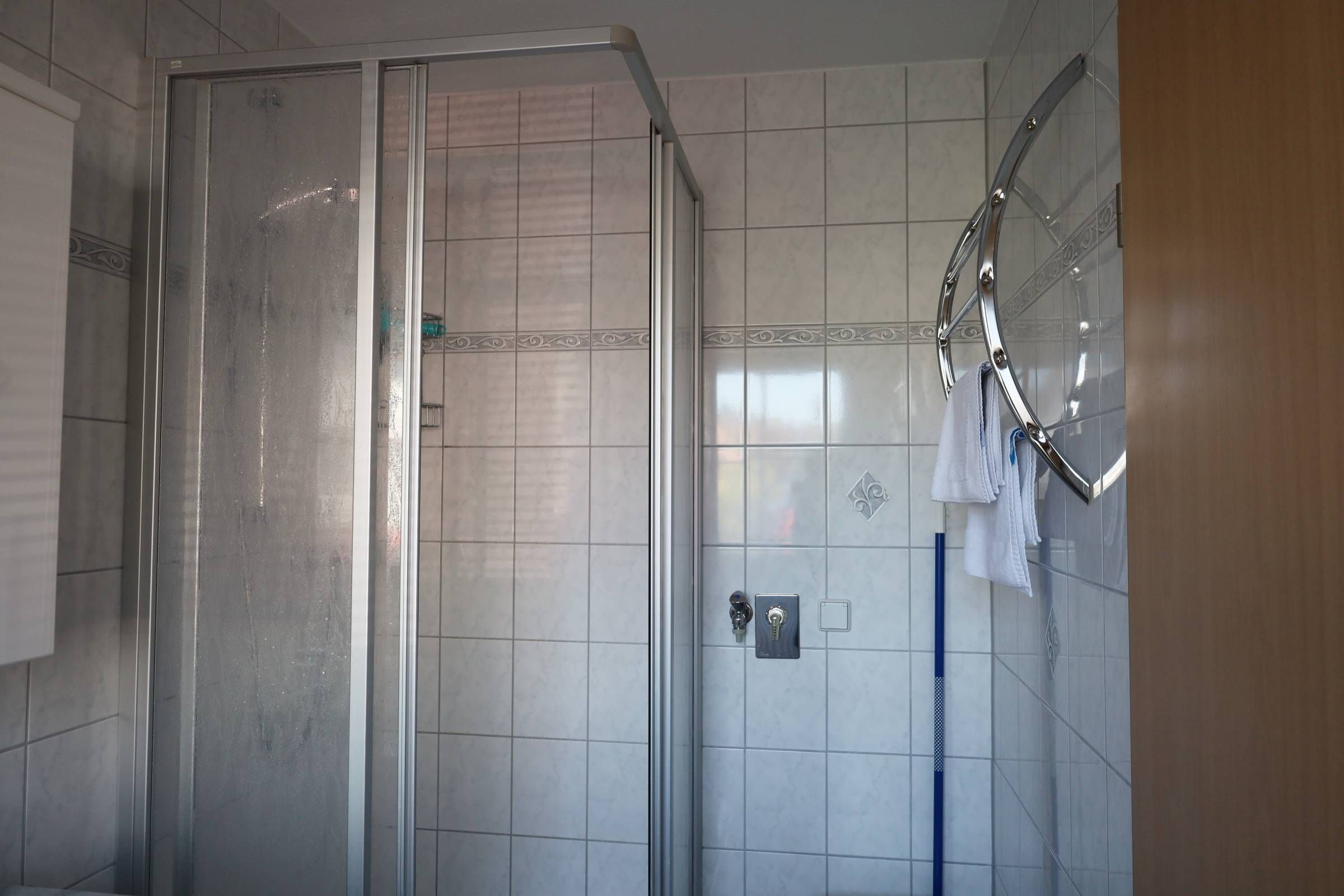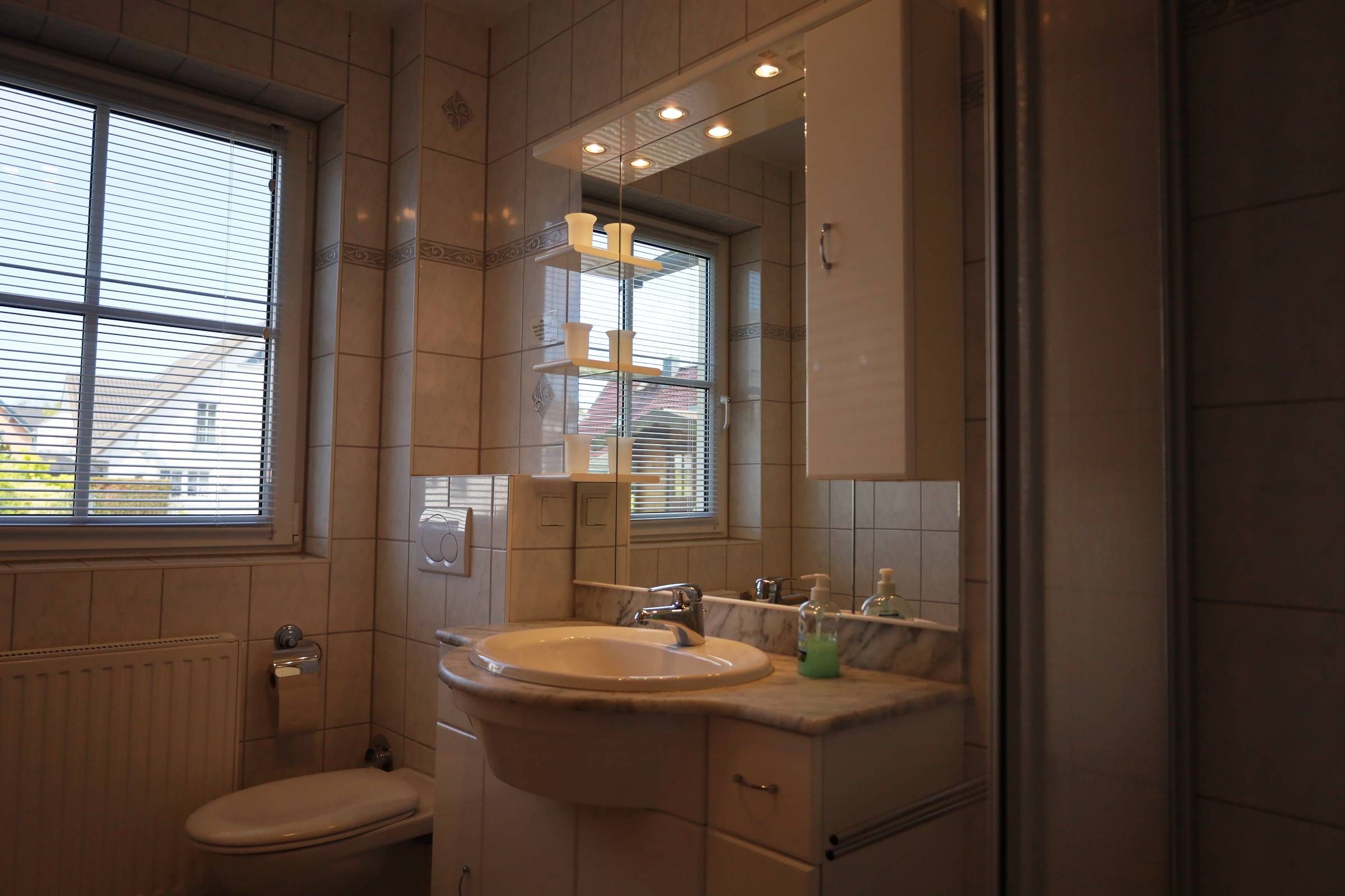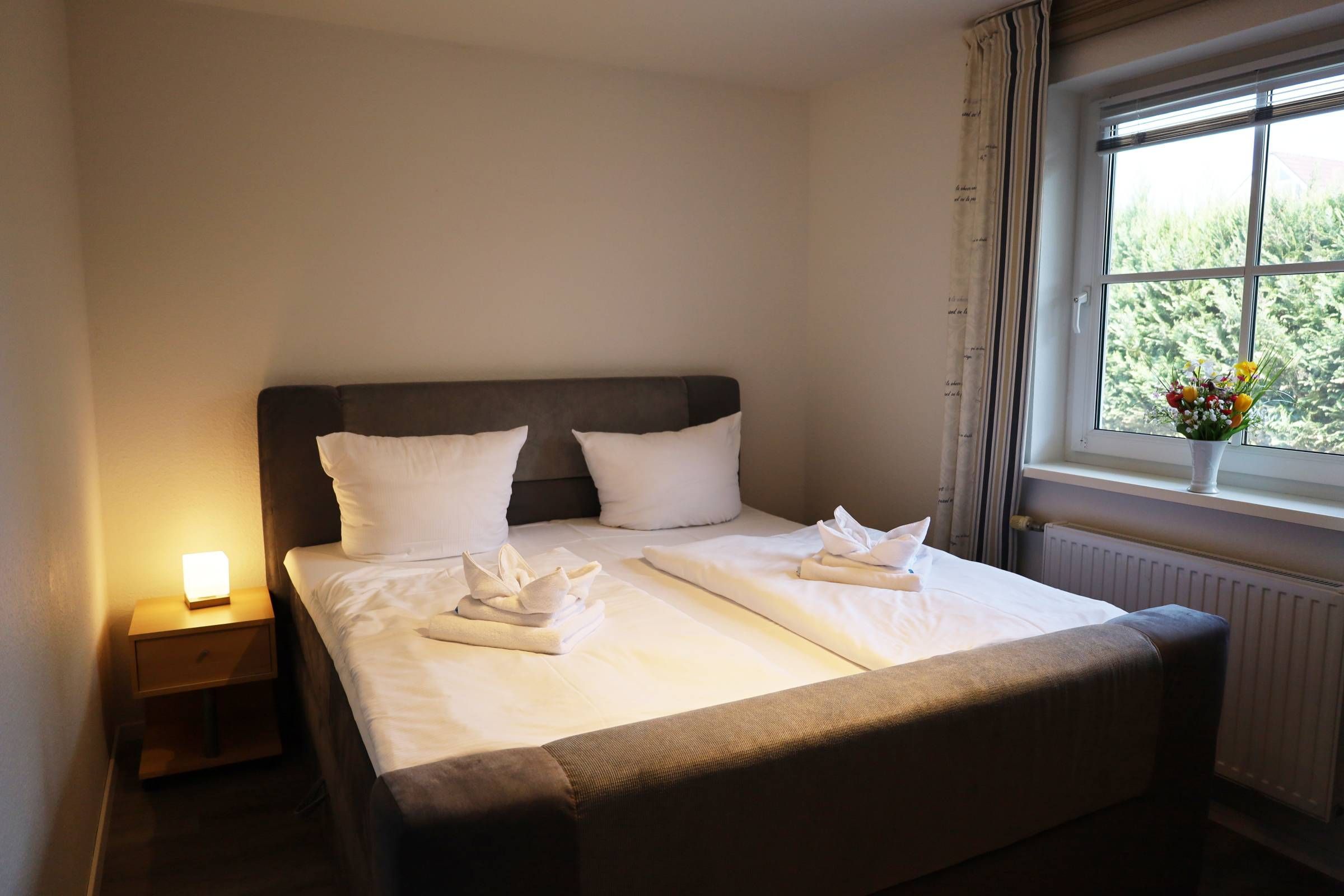 Das Badezimmer mit Fenster ist mit einer Dusche ausgestattet. Das Schlafzimmer verfügt über ein Doppelbett und einem großem Kleiderschrank.