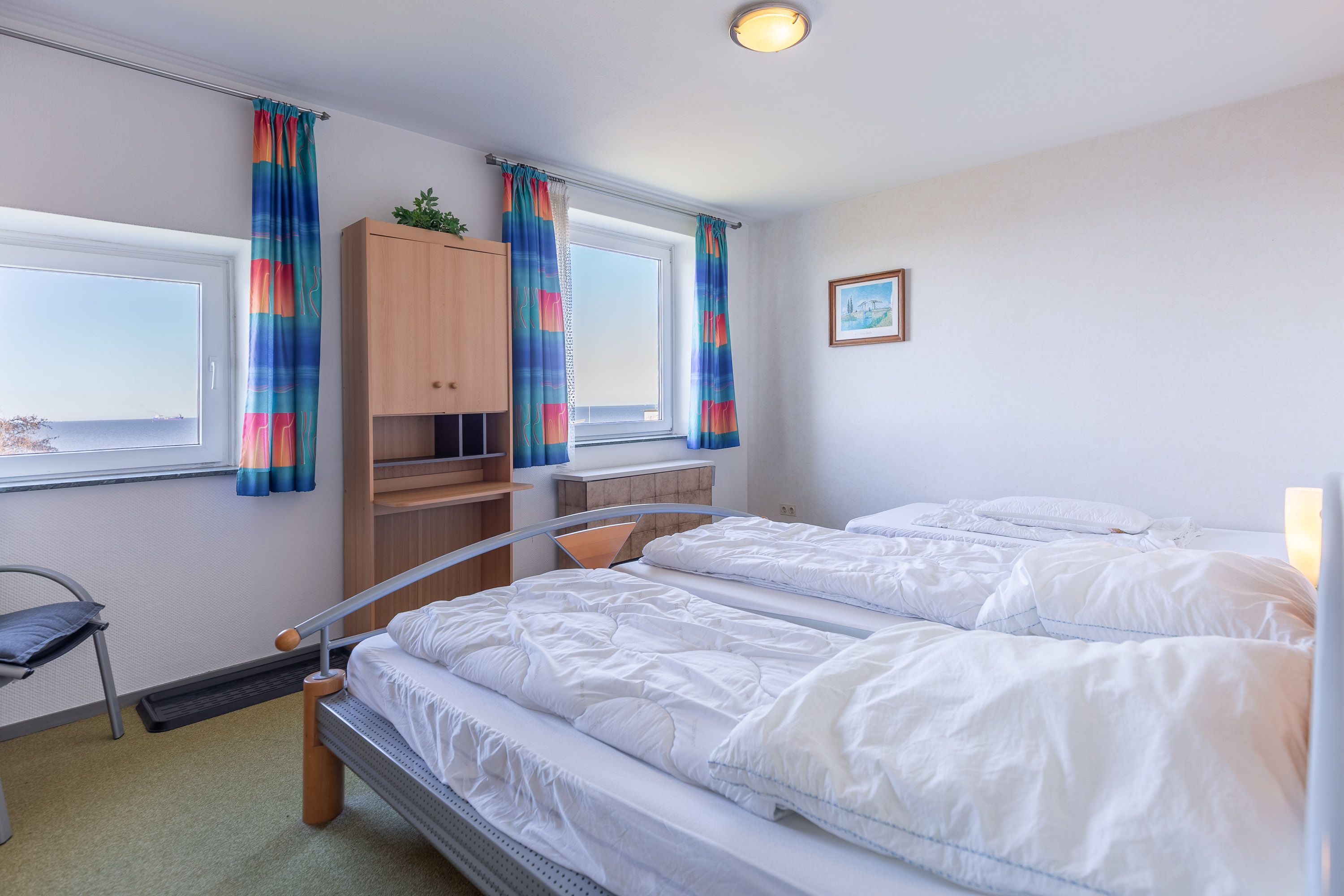 Morgens die Augen aufschlagen, das Meeresrauschen genießen und den ersten Blick auf die Nordsee werfen - kann es einen besseren Start in den Tag geben? Auf 55 m² bietet die Ferienwohnung ein großes Schlafzimmer mit Doppelbett, zusätzlichem Einzelbett und traumhaftem Meerblick.