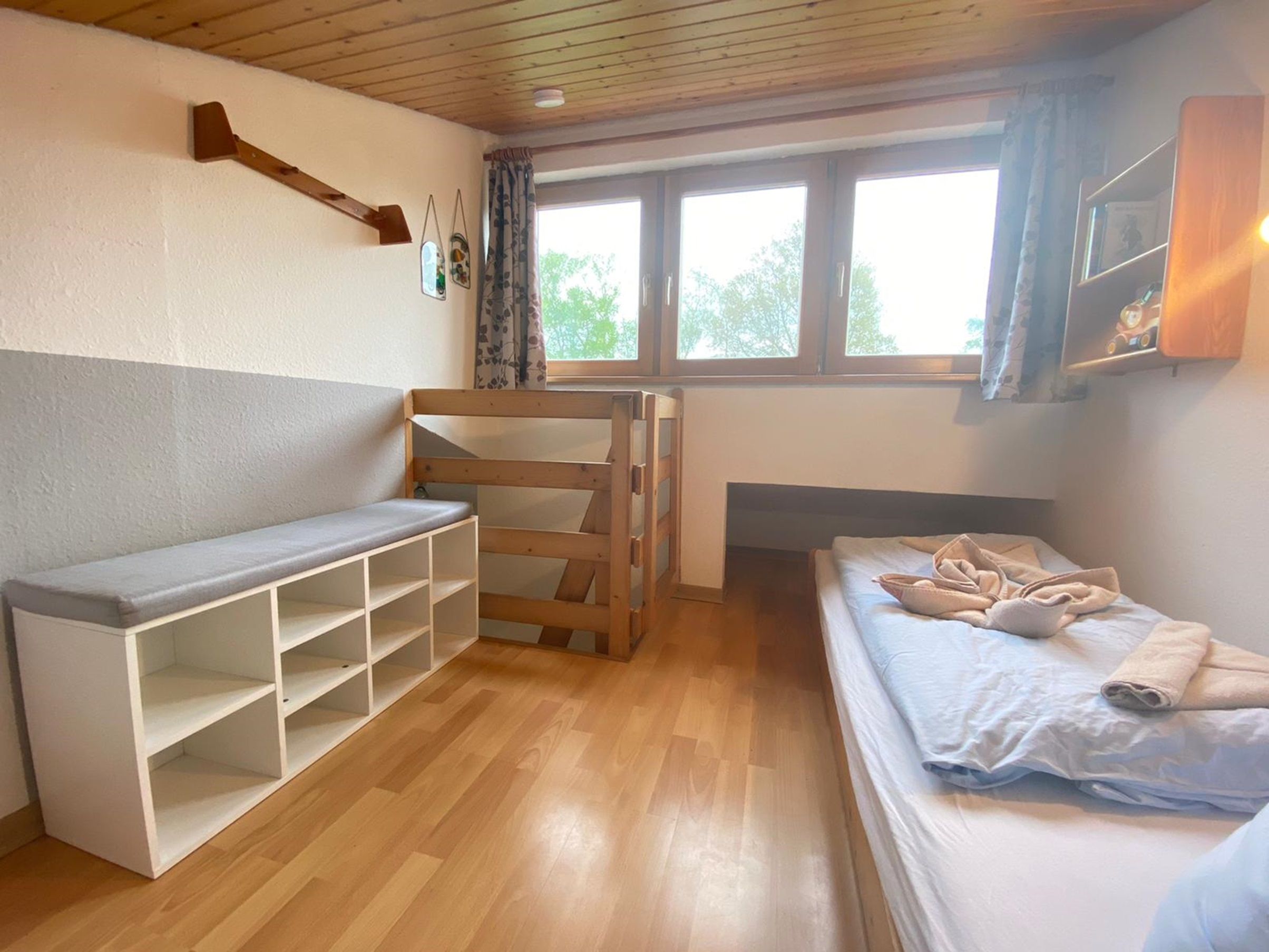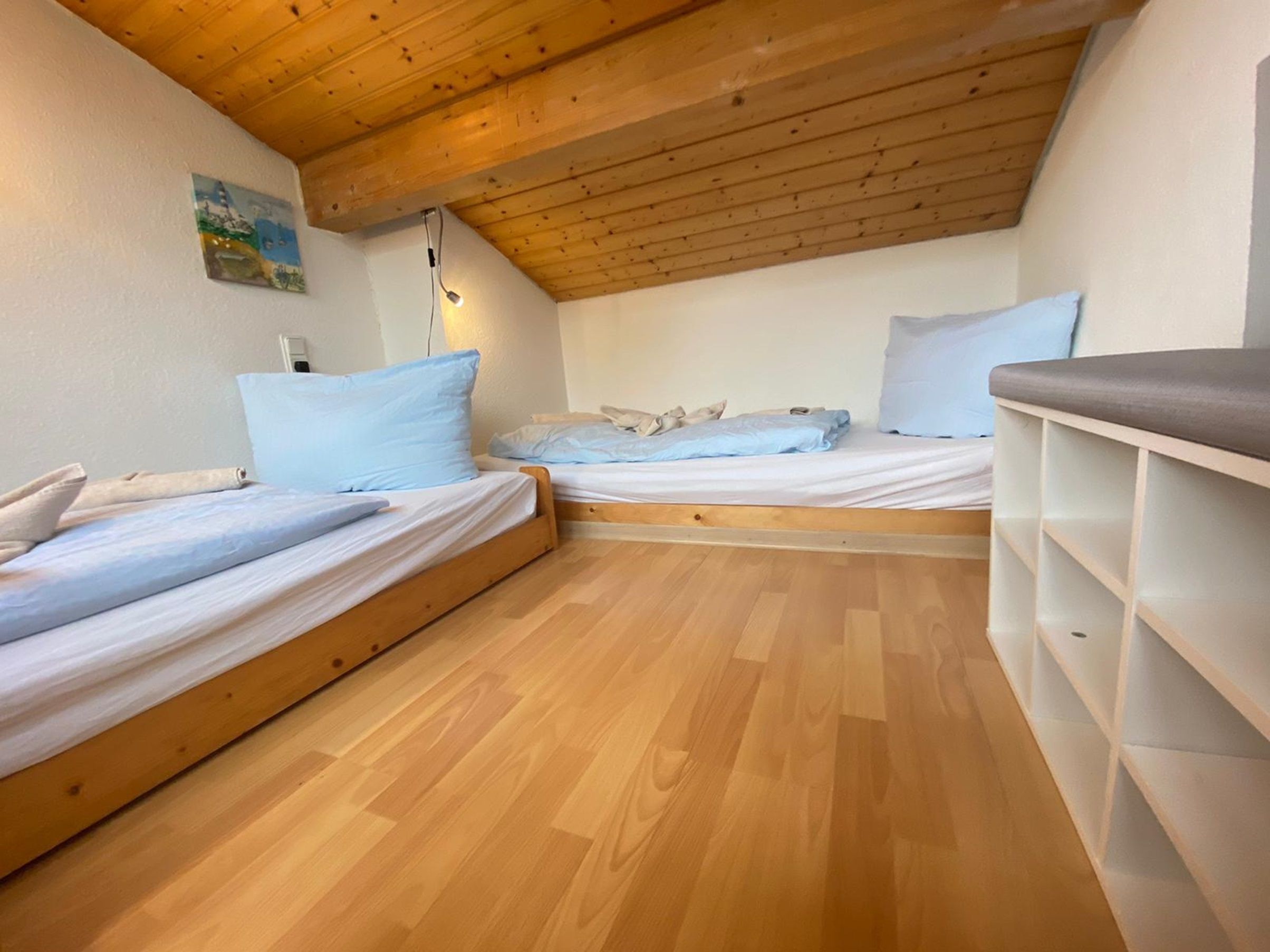 Im idyllischen Feriendorf Sehestedt gelegen bietet unser Haus Seepferdchen alles, was Sie für einen ruhigen erholsamen Urlaub brauchen. Im großen Wohn-Essbereich befindet sich eine Küchenzeile, die mit allem ausgestattet ist, um entspannt zu kochen. Es gibt ein gemütliches Ecksofa und einen Essplatz für vier Personen sowie ein Tageslichtduschbad mit WC. Vom Wohnzimmer aus gelangen Sie zur teilweise überdachten Terrasse. Der kleine offene Garten ist überwiegend naturbelassen. Der erste Schlafraum ist ausgestattet mit einem Doppelbett 180x200. Vom Flur geht es über eine steile Holztreppe auf eine offene Empore mit zwei Einzelbetten (keine Stehhöhe für Erwachsene) Dieser Raum ist nicht geeignet für Kleinkinder.