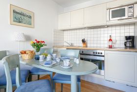 Das 2-Raum-Appartement 16 mit offenem Balkon zur Seeseite befindet sich im 2. Obergeschoss und ist ca. 35 m² groß. Die Wohnung ist zweckmäßig eingerichtet. Die komplett ausgestattete Küchenzeile verfügt über einen Geschirrspüler, Elektroherd, Kühlschrank und weiteren nützlichen Küchengeräten wie Kaffeemaschine, Toaster, Wasserkocher usw. Das Bad ist mit einer Dusche ausgestattet. Im separaten Schlafzimmer befinden sich u.a. ein Doppelbett (Boxspringbett) und ein Kleiderschrank mit eingebautem Safe. WLAN steht Ihnen kostenfrei zur Verfügung. Ein Pkw-Stellplatz für Gäste des Appartements befindet sich auf dem Parkplatz neben der Tankstelle (ca. 1 km von der Unterkunft entfernt, Be- und Entladen an der Unterkunft möglich).