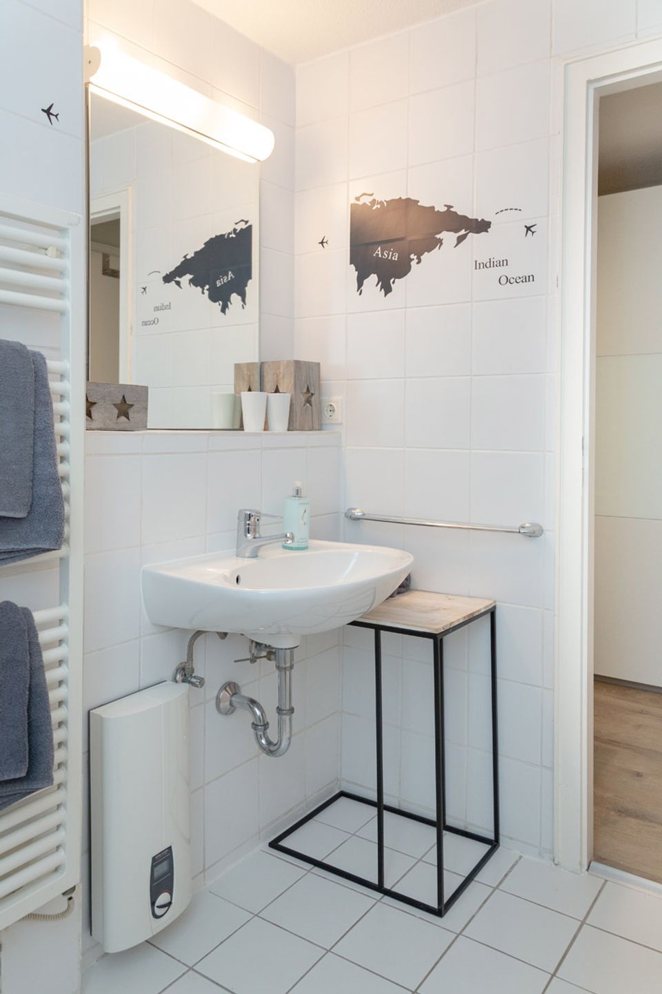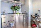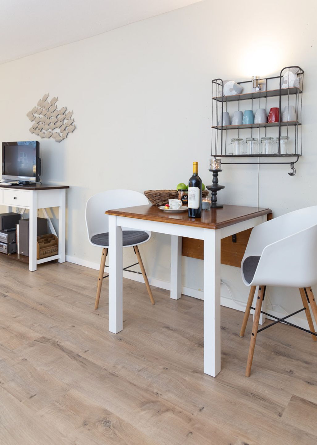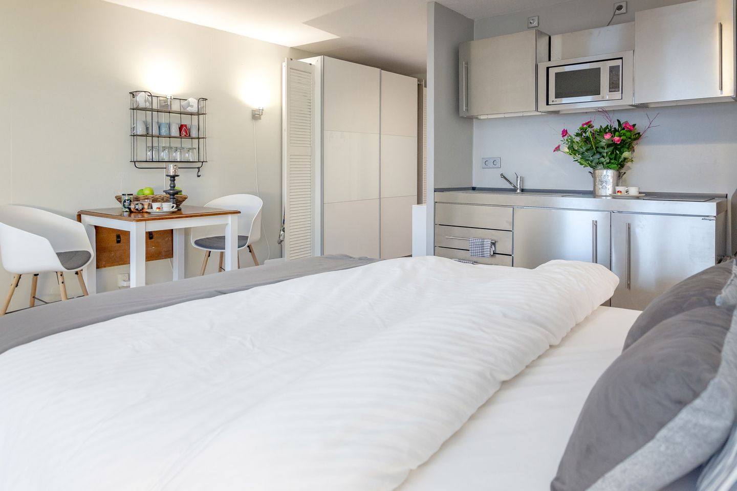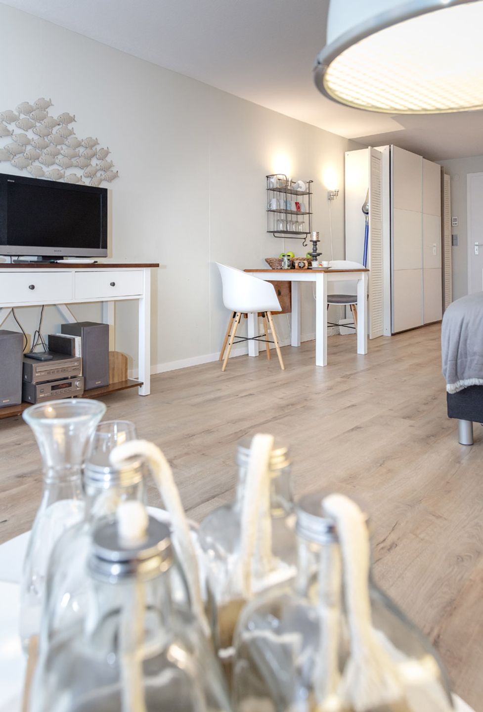 Voll ausgestattet Küche (Mikrowelle, Geschirrspüler, 2 Platten-Cerankochfeld und Nespresso Maschine), kleine Essecke, sowie der Wohn-/ Schlafbereich mit einem Boxspringbett und einem Schlafsofa (jeweils 160 x 200cm). Hier stehen Ihnen also 2 separate Schlafmöglichkeiten zur Verfügung. Diese Wohnung hat einen Balkon in Ostausrichtung mit Morgensonne im Sommer. Die Wohnung erreichen Sie bequem mit einem Fahrstuhl. Im Haus gibt es Abstellmöglichkeiten für Ihre Fahrräder.